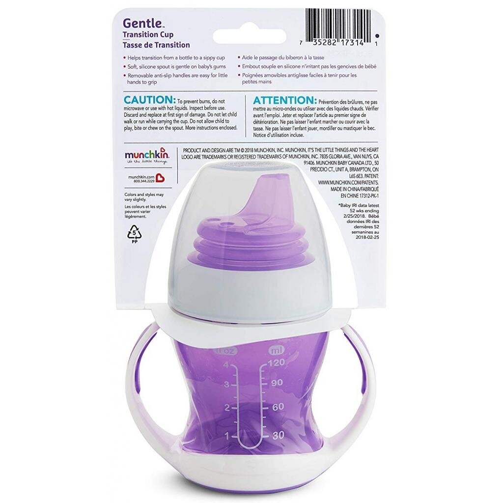 Пляшка непролівная Munchkin Gentle Transition 118 мл із силіконовим носиком, допоможе дитині навчитися пити самостійно. Безпечний для ясен малюка силіконовий носик. М'які ручки, що знімаються, дозволяють легко утримувати пляшечку. Герметична кришечка запобігає виливанню рідини.