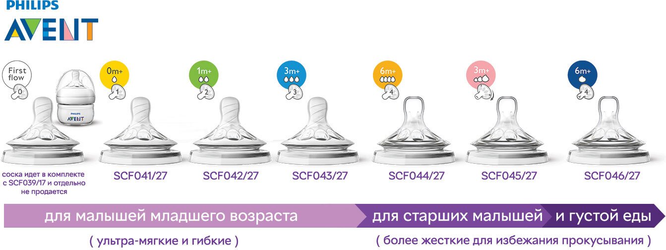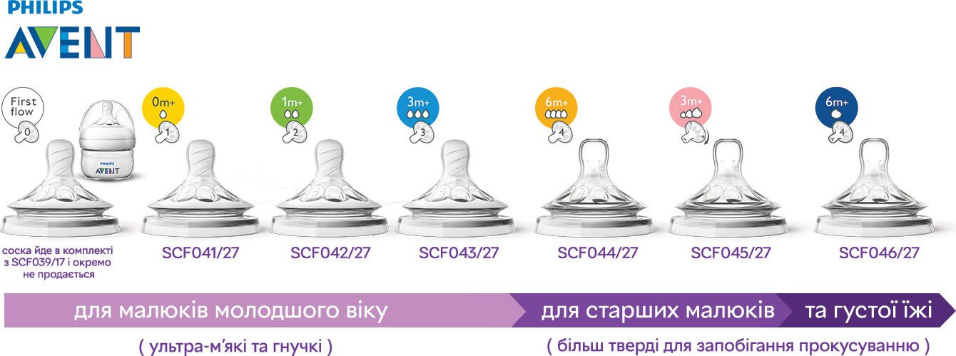 У лінійці Philips Avent Natural є соски різної м'якості та швидкості потоку, які підійдуть для різних етапів розвитку вашого малюка. Пляшка Philips Avent серії Natural виготовлена з матеріалу, що не містить бісфенолу-А* (поліпропілен). До даної пляшечки підходять соски серії Natural. Обирайте соску залежно від віку Вашого малюка.