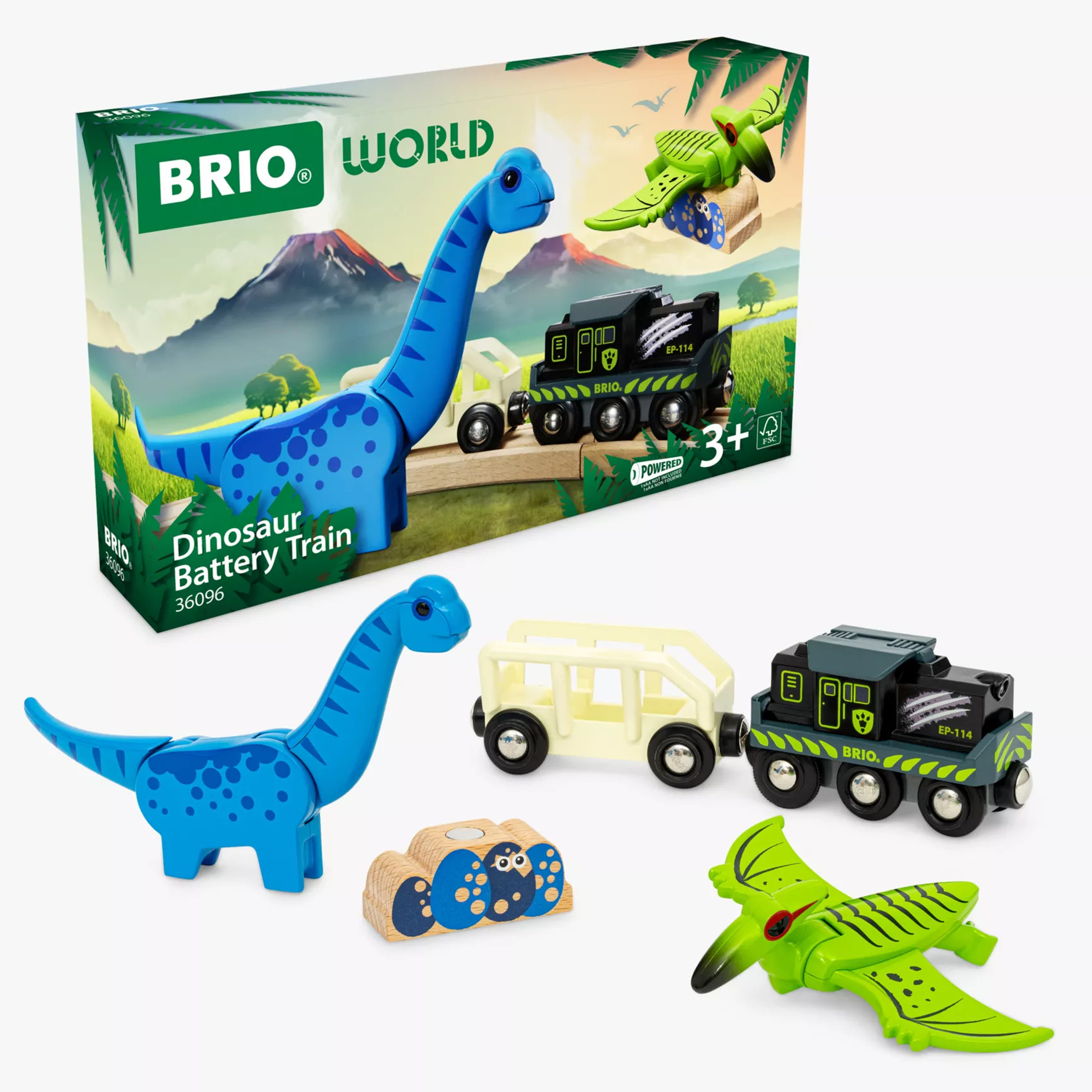 Динозавр подорожує доісторичним світом BRIO World! Відправляйтеся в доісторичну пригоду з набором Поїзд BRIO на батарейках з динозаврами (36096).