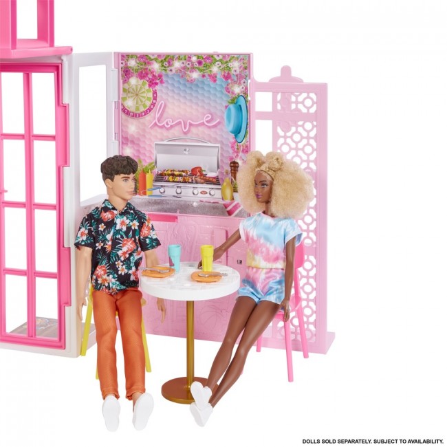Вітайте друзів біля дверей, насолоджуйтеся приготуванням їжі на кухні й подавайте страви на стіл, біля якого можна розмістити два стільці. Після насиченого дня покладіть ляльку Barbie (продається окремо) у ліжко, щоб вона як слід виспалася вночі.