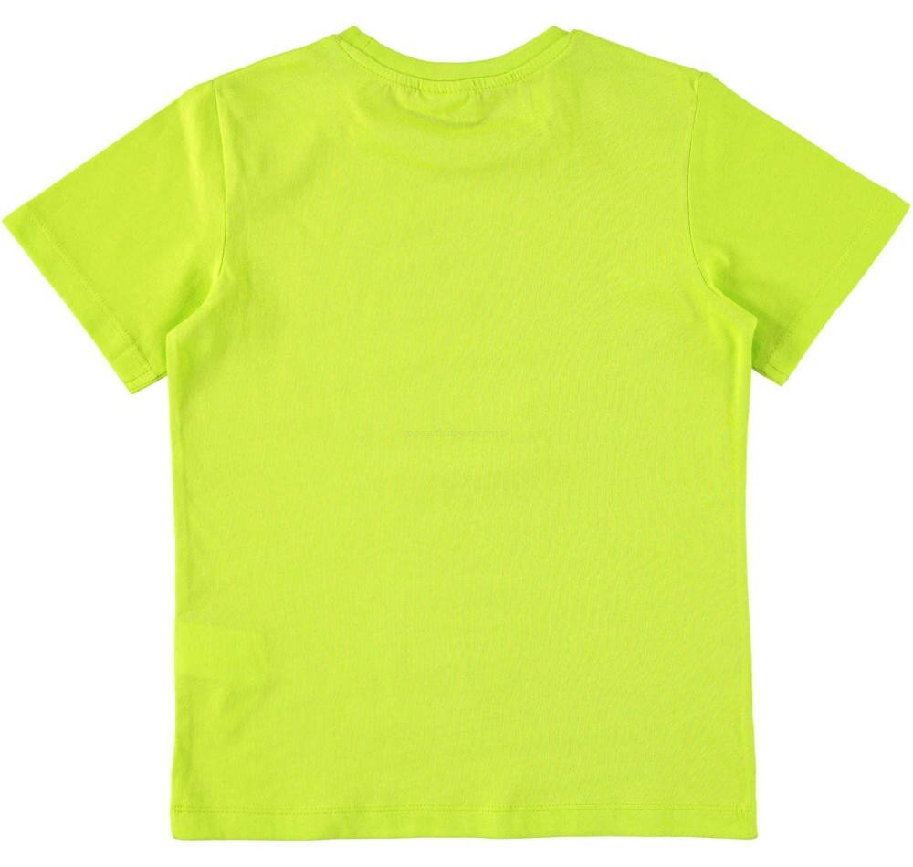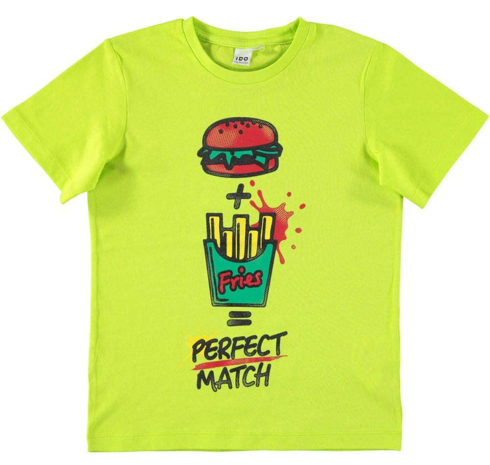 Яскрава бавовняна футболка для хлопчика 7 - 8 років на кожен день. Має круглу горловину та короткі рукава. Прикрашена "смачним" принтом бургера та картоплі фрі, написом Perfect Match. Чудовий вибір для маленького шанувальника фастфуду. Колір - салатовий.
