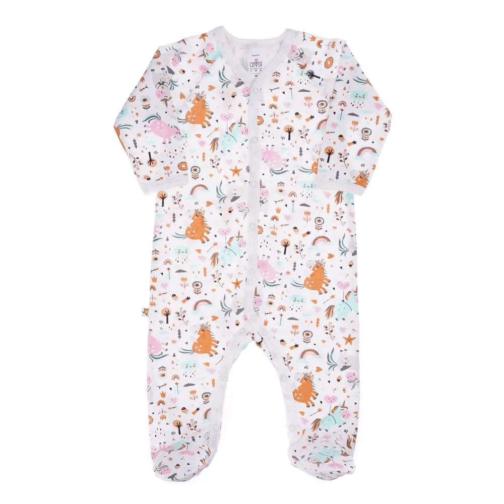 Яскравий дизайнерський принт комбінезона створить чарівний образ. Завдяки рукаву-реглані комбінезон має хорошу посадку по плечах дитини. Пошитий швами назовні, щоб шви не натирали м'яку шкіру новонародженої дитини. Модель повнорозмірна, виконана з закритими стопами. Застібається на кнопки.