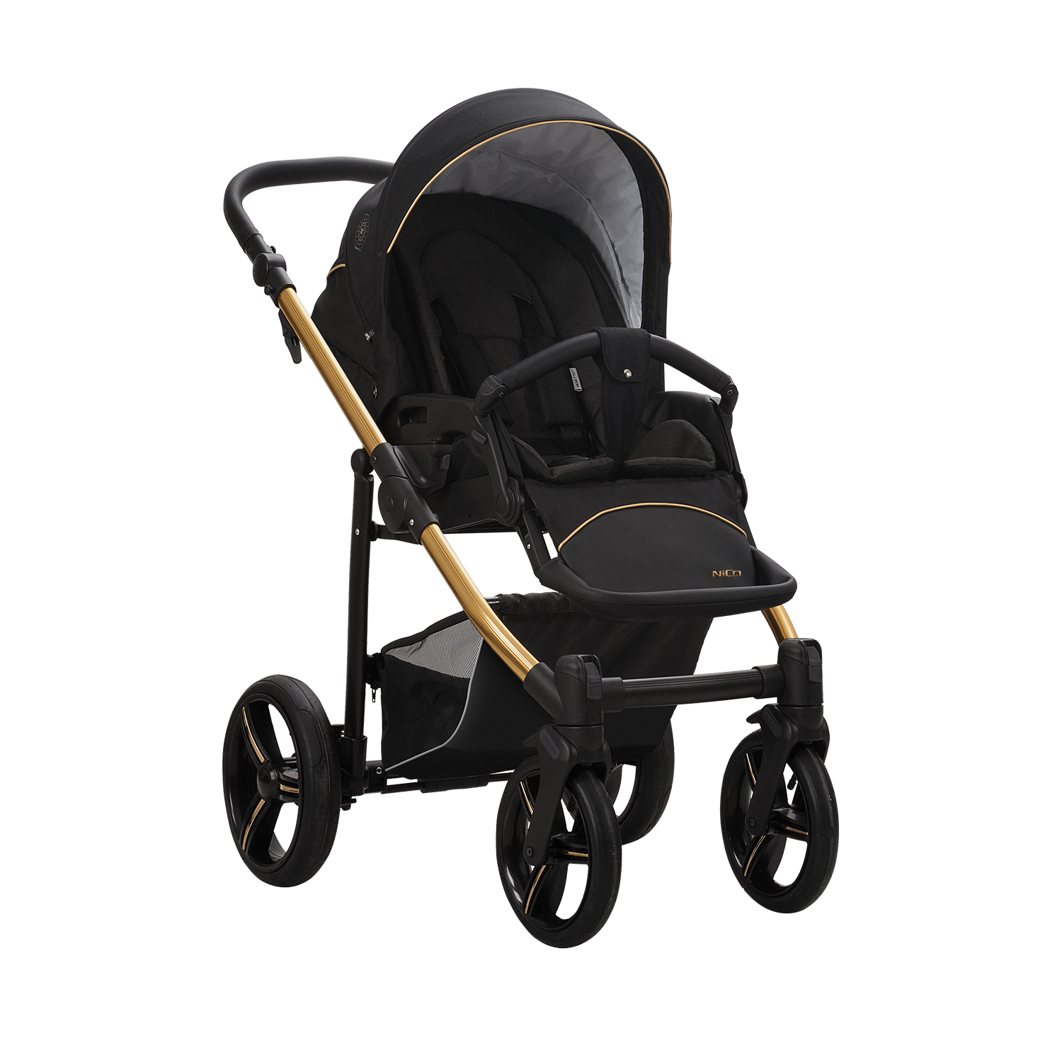 Нова лінійка ESTILO прогулянкової коляски Nico від ТМ Bebetto – модне поєднання текстилю темних кольорів і метала золотого, срібного або бронзового кольору. Тонкі, елегантні елементи кольору шасі, якими декорована обивка, підкреслюють особливий стиль та ефектність.