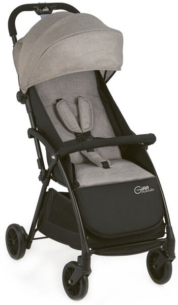 Прогулянкова коляска Cam Giramondo - нова модель від відомої італійської компанії. Відрізняється компактністю, малою вагою і високою надійністю. Може використовуватися приблизно з народження і до 3 років. З особливостей варто відзначити великий, продуманий капюшон, який відмінно закриває малюка навіть в положенні сну. Накидка на ніжки, досить велика і тепла, поставляється в комплекті, що не так часто зустрічається в колясках цього типу. Рама виготовлена з алюмінію, легка і міцна. Хід - плавний і комфортний. Передня пара коліс - обертається на 360 градусів з можливістю блокування. Задня пара коліс - оснащена ножним гальмом стоянки.