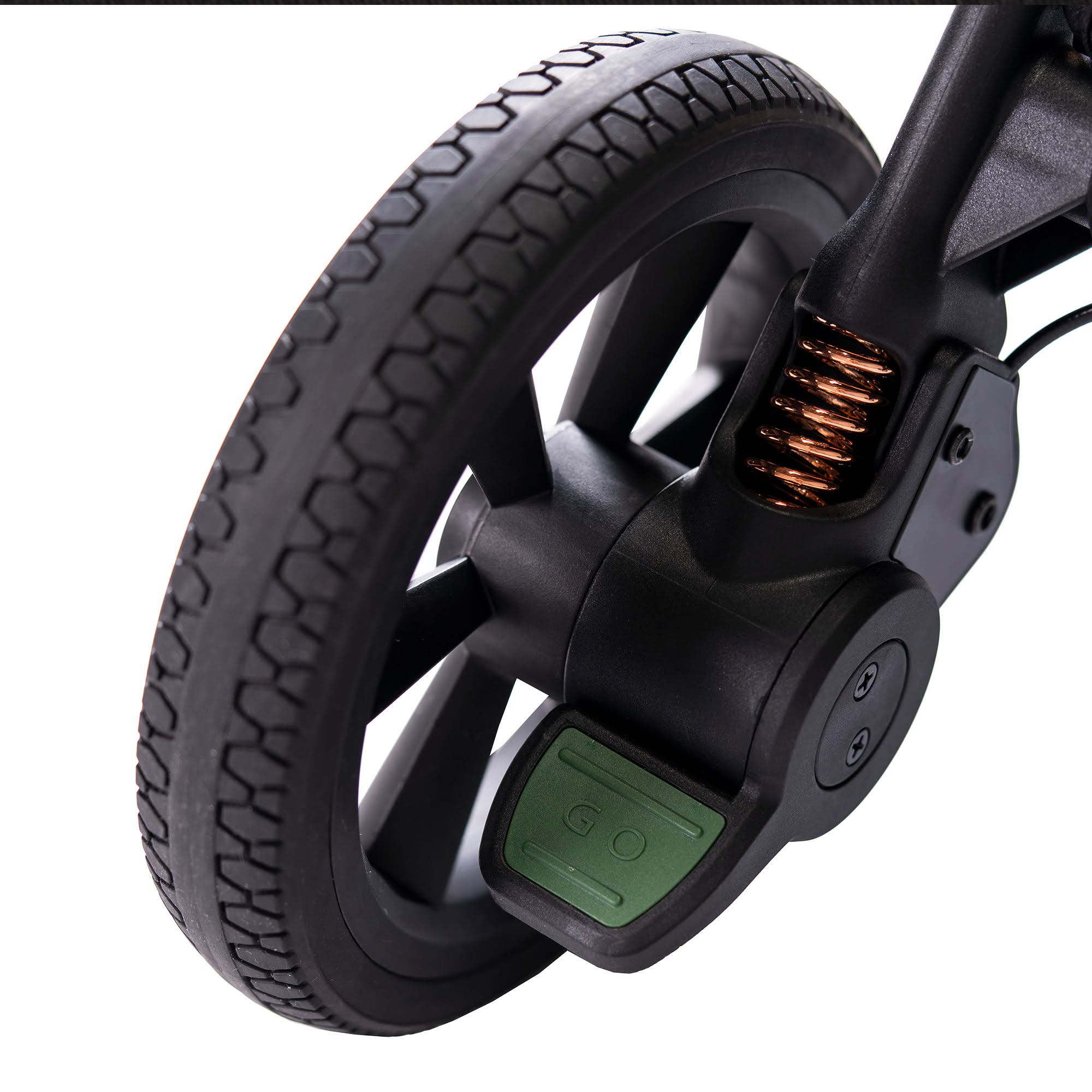 - Великі колеса, що не потребують обслуговування, виготовлені з матеріалу EVA, покриті зовні гумовим шаром для збільшення зчеплення