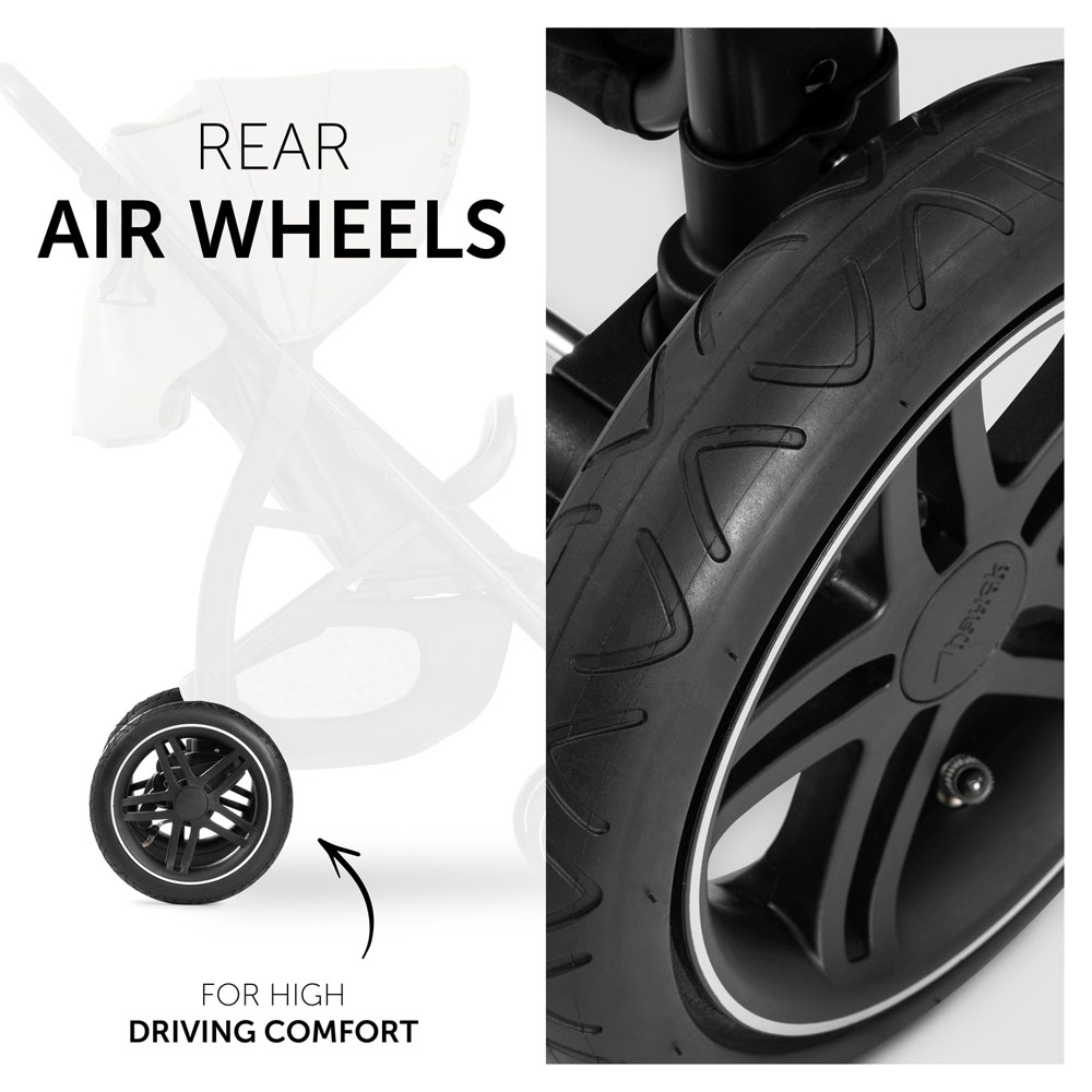 Коляска з великими колесами підвищеної прохідності, що поглинають нерівності, може використовуватися як у місті, так і за містом. Поворотні передні колеса полегшують зміну напрямку та можуть бути зафіксовані на нерівній місцевості.