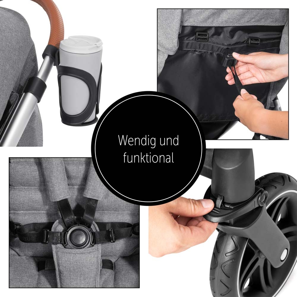 Захисний бампер забезпечує малюкові не тільки безпеку, але й свободу рухів. Шкірозамінник і м'яка поверхня створюють добре продуманий ансамбль разом з регульованою по висоті ручкою, що робить Uptown чудовим помічником для батьків різного зросту. Напої завжди під рукою в практичному підскляннику.