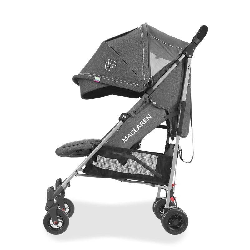 Коляска прогулочная Maclaren Quest - полегшена модель, з якої просто подорожувати, вона зручна в зберіганні, транспортуванні, перенесенні (є ремінець для носіння через плече і текстильна ручка для перенесення). Регулювання спинки однією рукою — зручно для батьків і не потривожить малюка на прогулянці. Система безпеки Newborn Safety System (складається з сітчастого бар'єру для ніг і вставки в головах), використовується в положенні для сну.