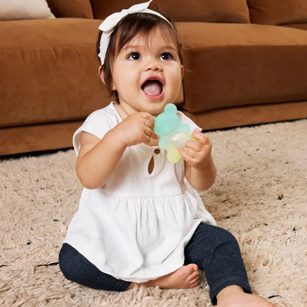 Вбудована петля дозволяє легко прикріпити іграшку до коляски, слінгу або сумки для підгузків. Милий дизайн у вигляді желейних ведмедиків із напівпрозорими кольорами омбре та «цукровим» ефектом додає додаткового сенсорного задоволення.
