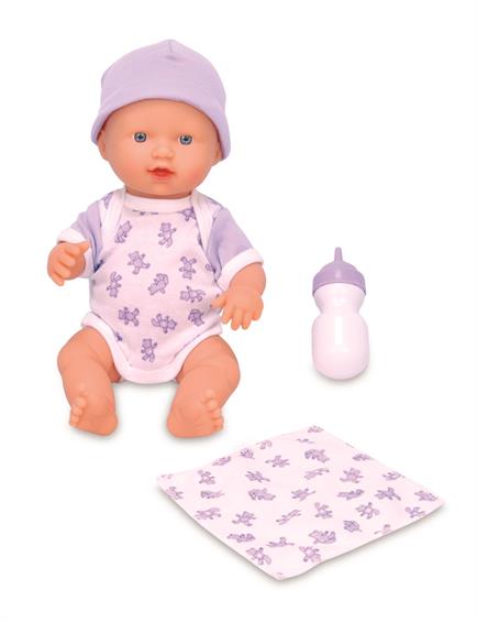 До комплекту входять: пупс з пластику та м'якого текстилю, довжиною 25 см; пляшечка; рушник.