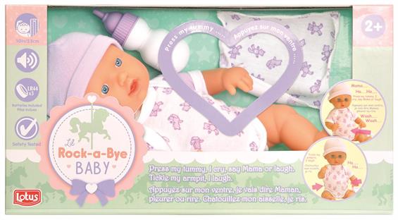 Дівчинці обовязково сподобається пупс від торгової марки Lotus, з яким буде цікаво грати в дочки-матері. Лялька може плакати, сміятися чи кликати маму. Для цього потрібно активувати точки на животі або руці пупса. Дівчинка зможе напоїти немовля з пляшечки, вкласти спати, укривши рушником, переодягнути.