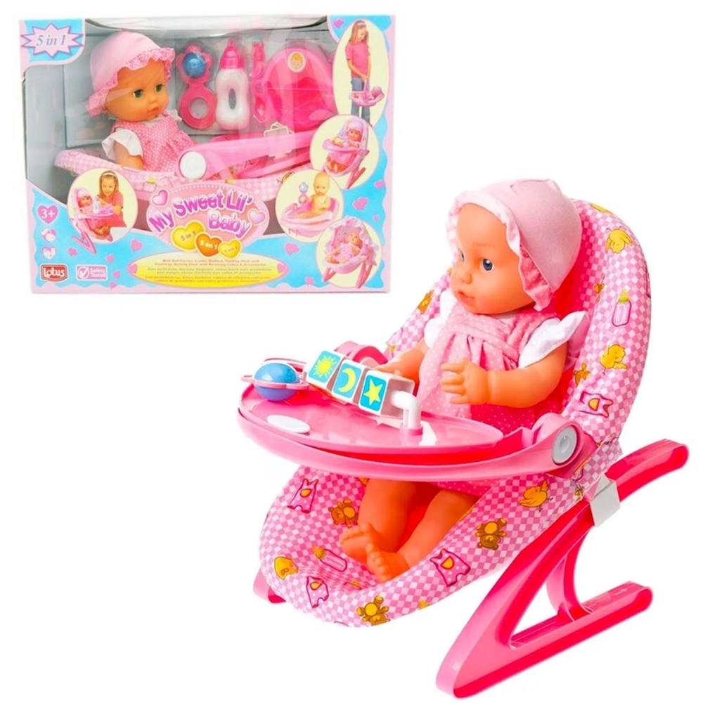 - Постачається з аксесуарами: брязкальцем, пляшечкою для годування, тарілкою, ложкою, виделкою, люлькою-гойдалкою.