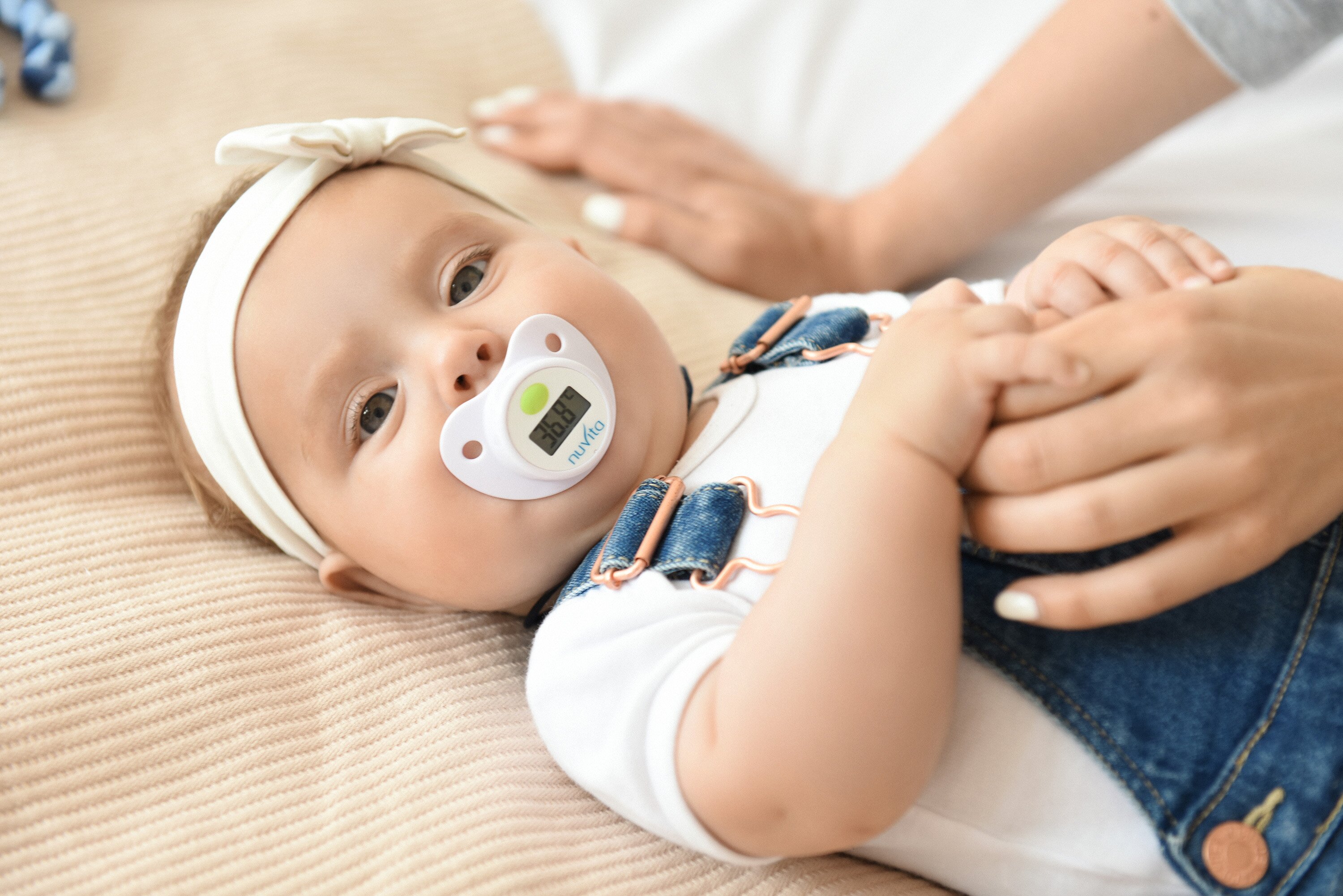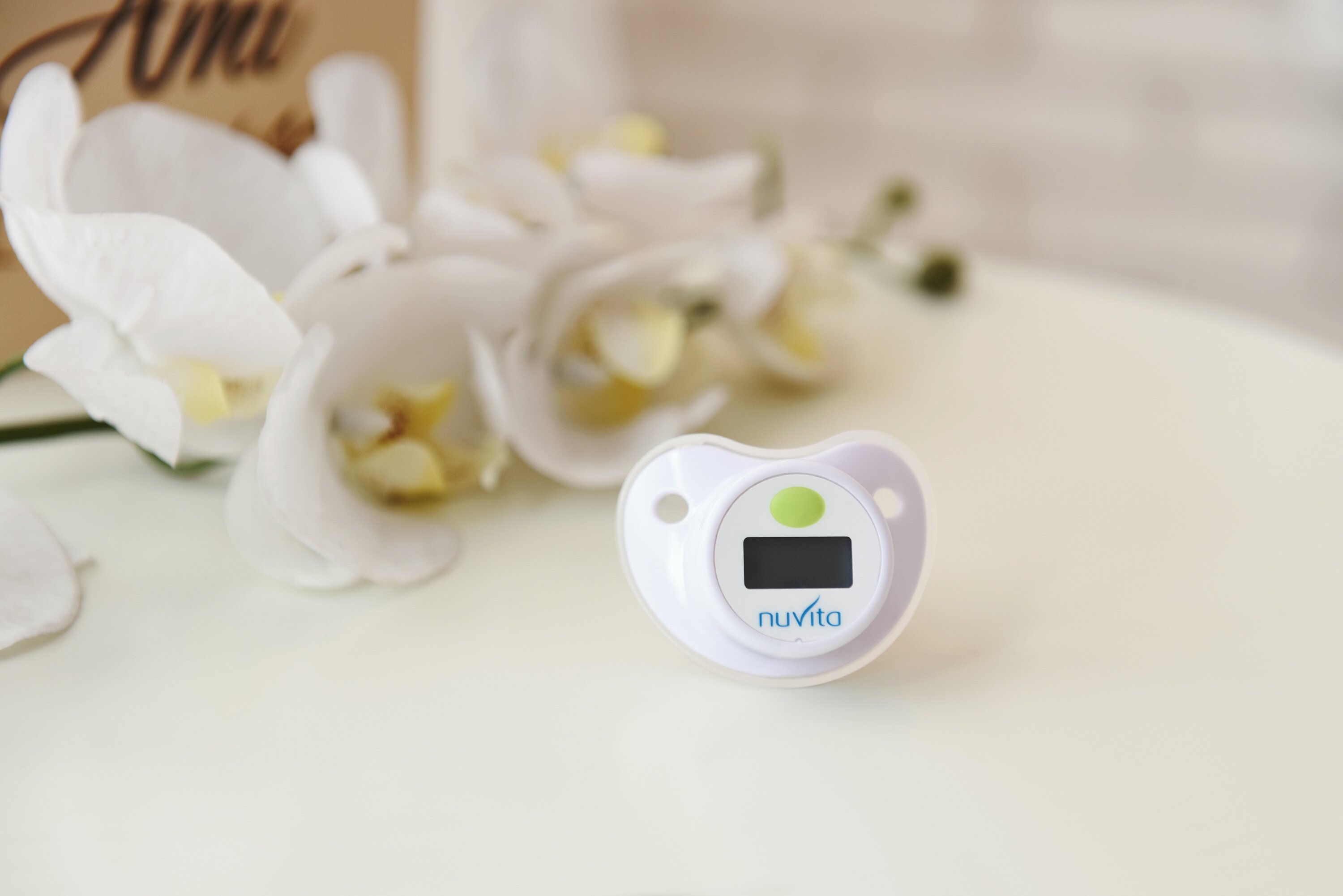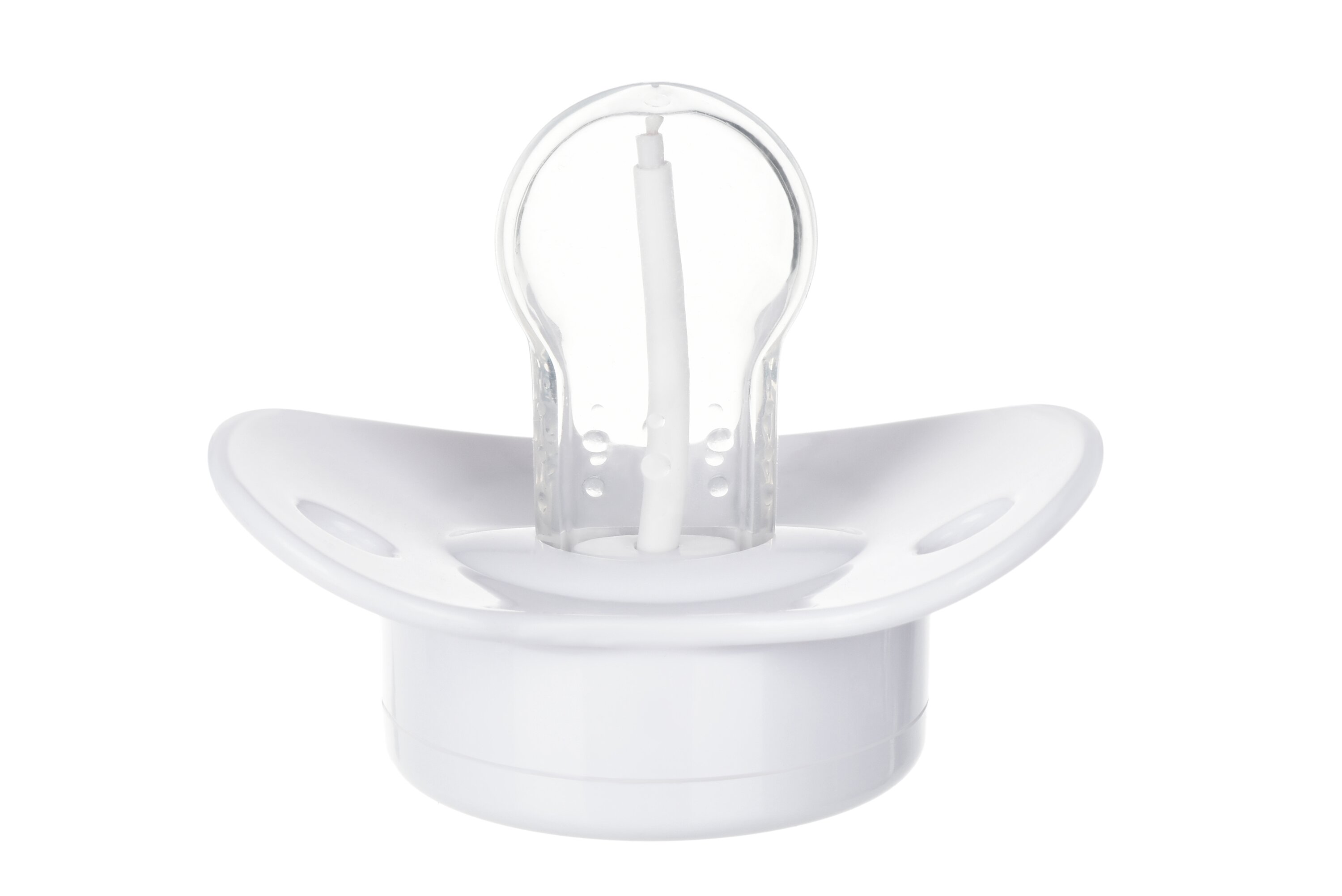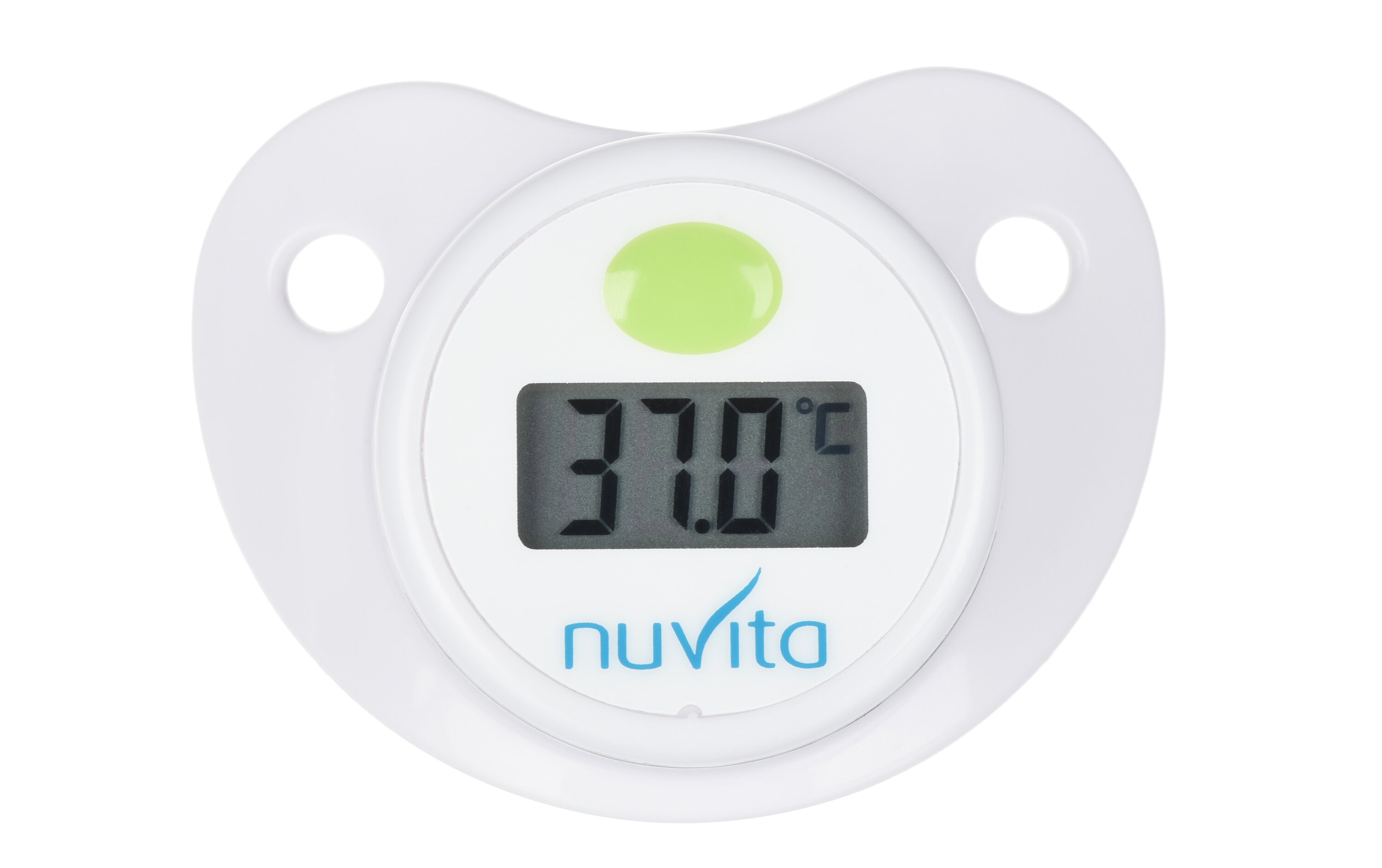 Пустушка-термометр білого кольору від Nuvita абсолютний «must have» для кожної мами. Завдяки поєднанню пустушки і термометра мама завжди зможе контролювати температуру свого малюка без зайвого клопоту і дискомфорту. Симетрична форма пустушки робить її зручною для малюка, а користуватися нею можна з самого народження. Пустушка-термометр працює за рахунок вбудованої батарейки. Термін дії батарейки становить 1000 циклів вимірювання температури. Пустушка виготовлена із силікону і пластика.