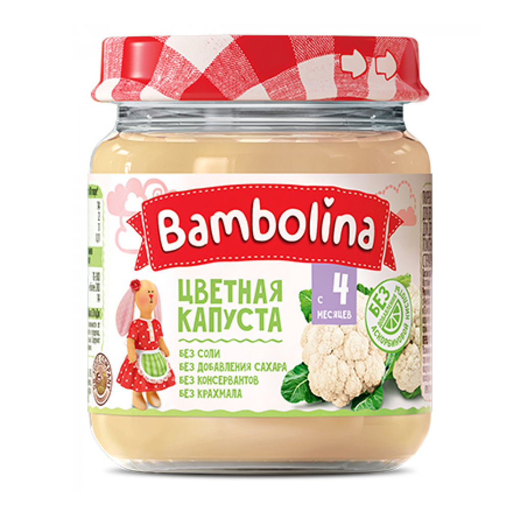 У цвітній капусті міститься цілий комплекс вітамінів: каротин, вітамін С, а також калій, натрій, магній і кальцій. Рослинний білок, що міститься у цвітній капусті, легко засвоюється організмом, тому цей продукт чудово підходить для раннього підгодовування (з 4,5 міс.) Пюре Bambolina виготовляється зі цвітної капусти, вирощеної під ретельним контролем наших фахівців.