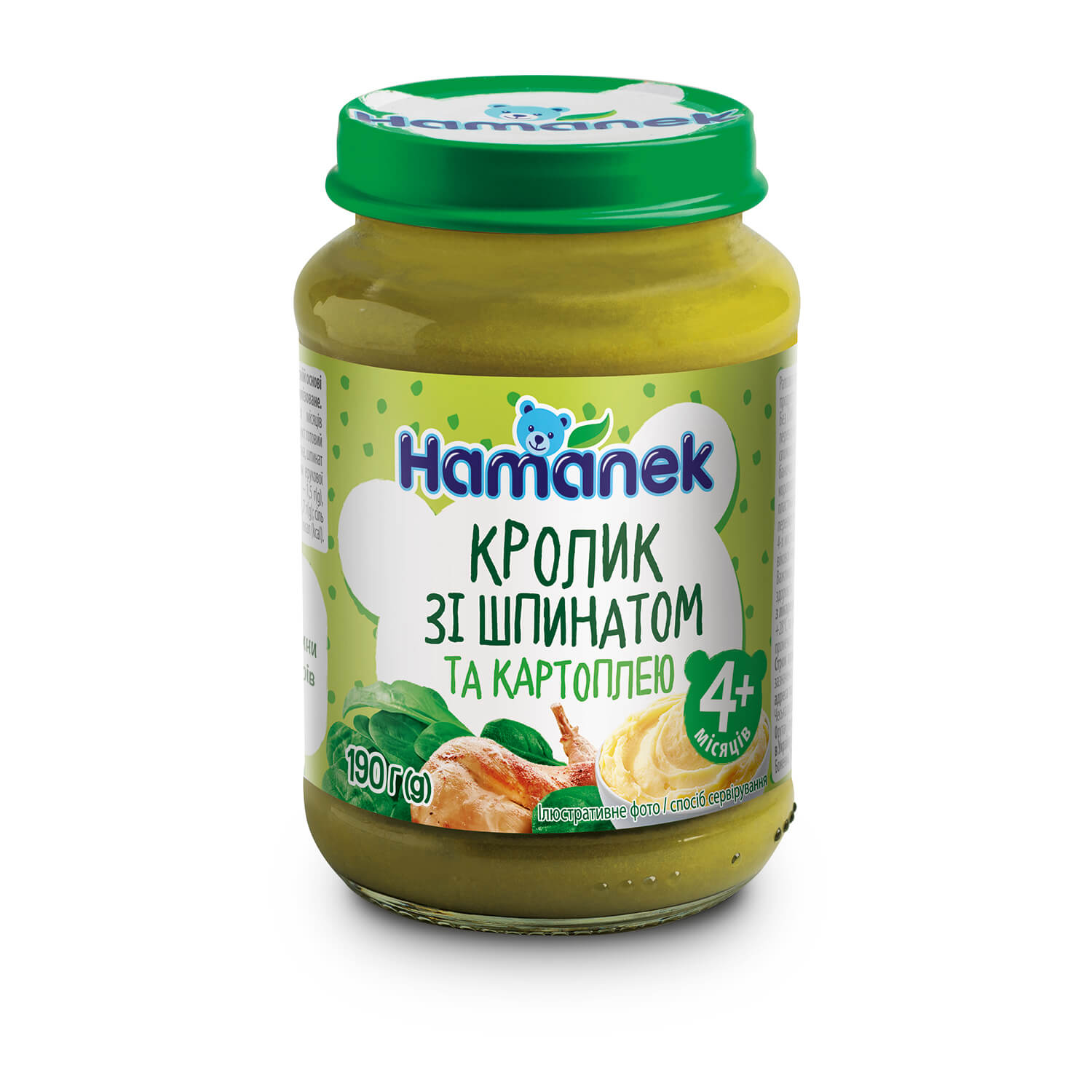 Склад: вода питна, картопляне пюре (39 %) (вода питна, картопляні пластівці), шпинат (20%), м'ясо кролика (10 %), картопляний крохмаль, олія рослинна рапсова.