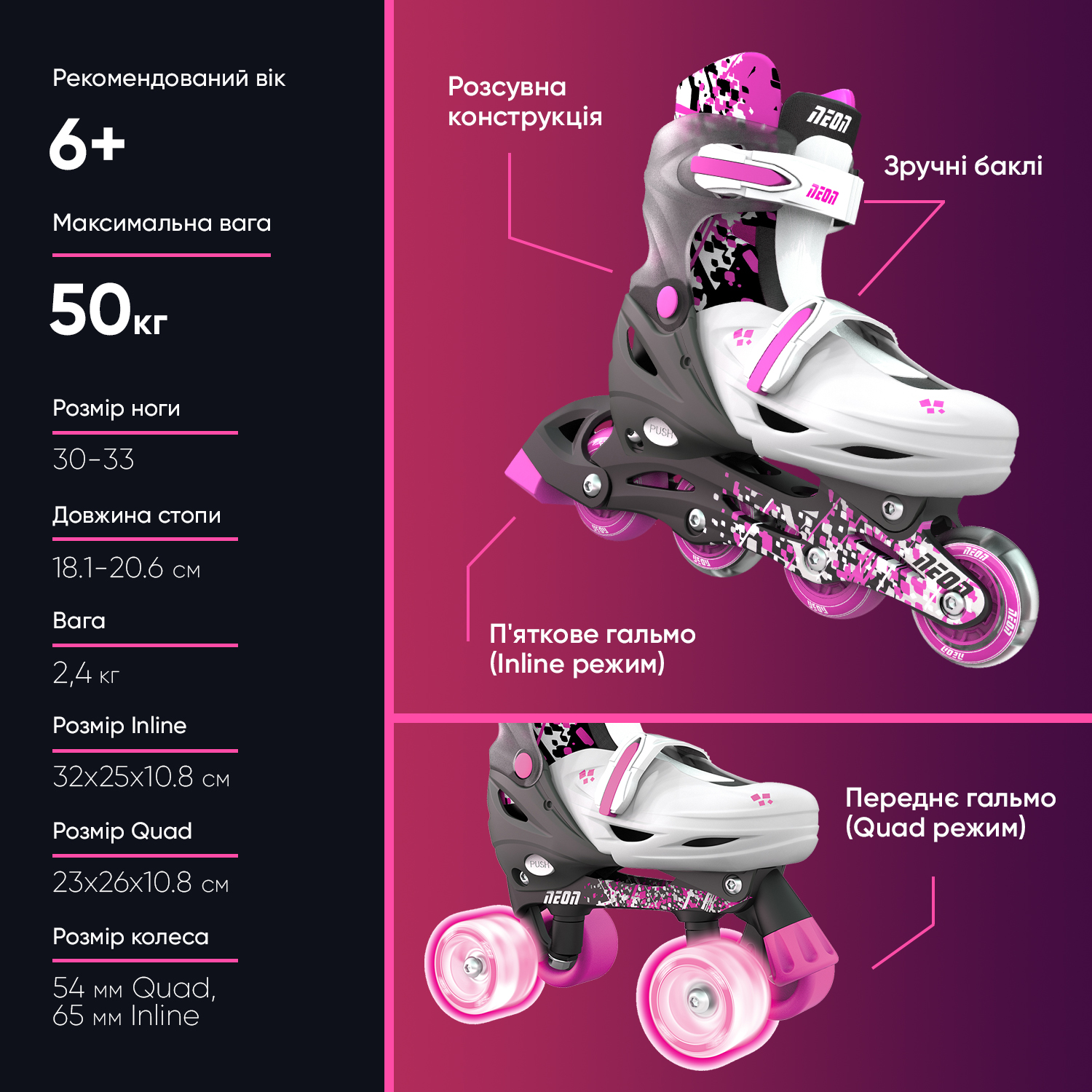 Це набір 2в1 включає в себе відразу 2 типу роликових ковзанів Inline (Лінійні, 4 колеса в ряд.) + Quad (по 2 колеса розташовані поперечно). Саме завдяки варіативності набір Neon Combo Skates буде зручний і корисний для дитини, якій тільки предстоїть освоїти роликові ковзани. Завдяки можливості варіативного вибору типу роликів в даній моделі, навчання буде проходити найбільш продуктивно і дозволить безпечно освоїти роликиі використовуючи переваги кожного з типів.