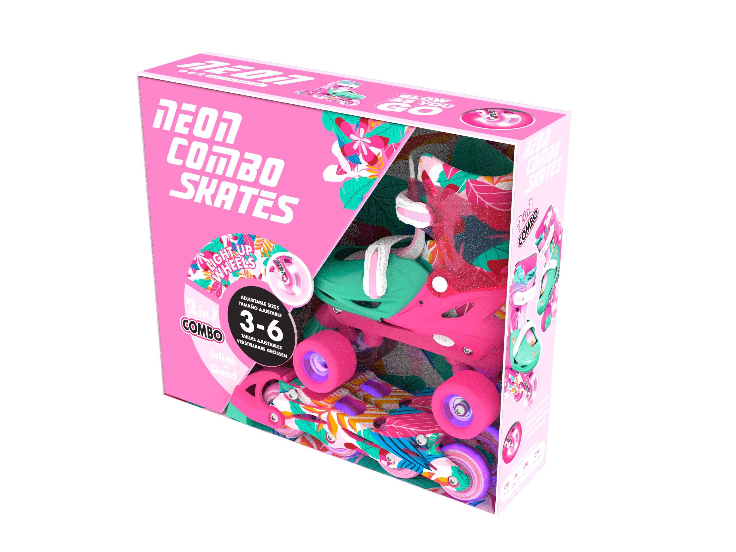 Цей набір 2в1 включає в себе відразу 2 типу роликових ковзанів - Inline (лінійні, 4 колеса в ряд) та Quad (по 2 колеса поперечно). Ролики Neon Combo Skates будуть зручними і корисними для дитини, яка лише починає опановувати катання. Завдяки варіативному вибору в даній моделі, навчання проходитиме продуктивніше і дозволить безпечно освоїти ролики, використовуючи переваги кожного типу.