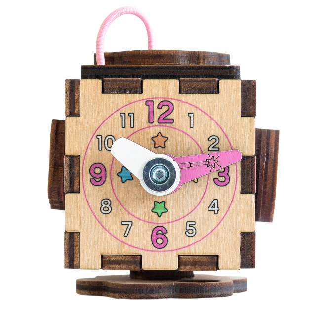 - годинник з яскравими кольорами, цифрами та обертальною стрілкою;