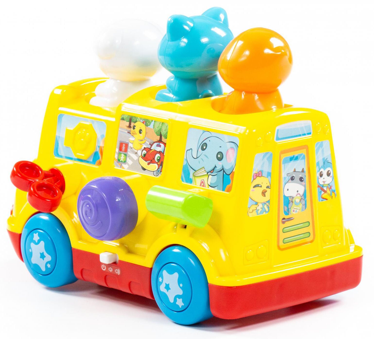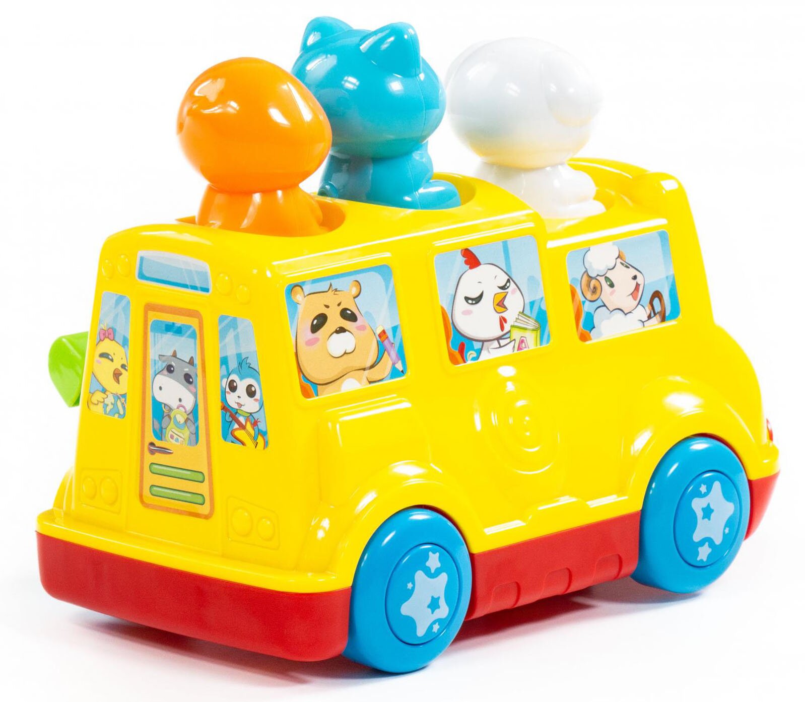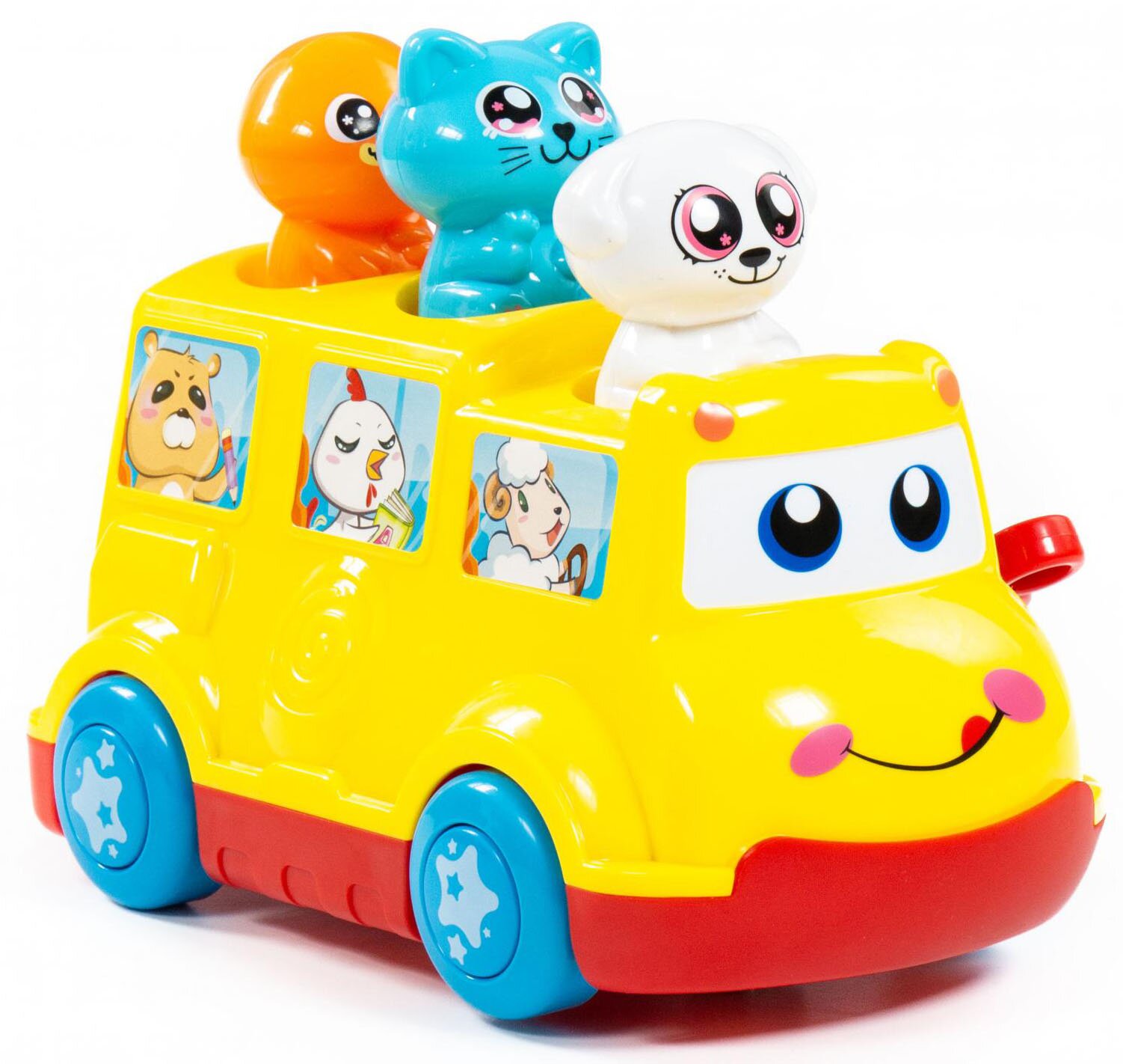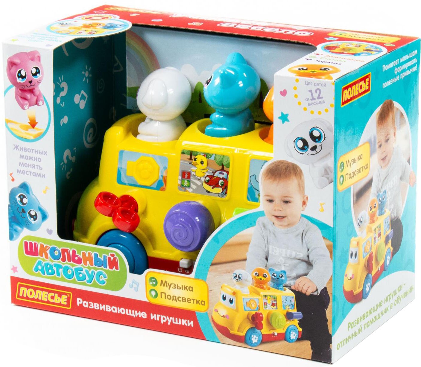 Іграшка розвивальна Шкільний автобус (у коробці) — це ще одна новинка від фабрики Полісся, спрямована на навчання дітей. Автобус виготовлений з якісного пластику, має яскравий дизайн та округлу форму деталей. Постачається в яскравій коробці. Конструкція автобуса передбачає наявність місць для пасажирів: кошеняти, каченяти та цуценяти. Тварин можна міняти місцями.