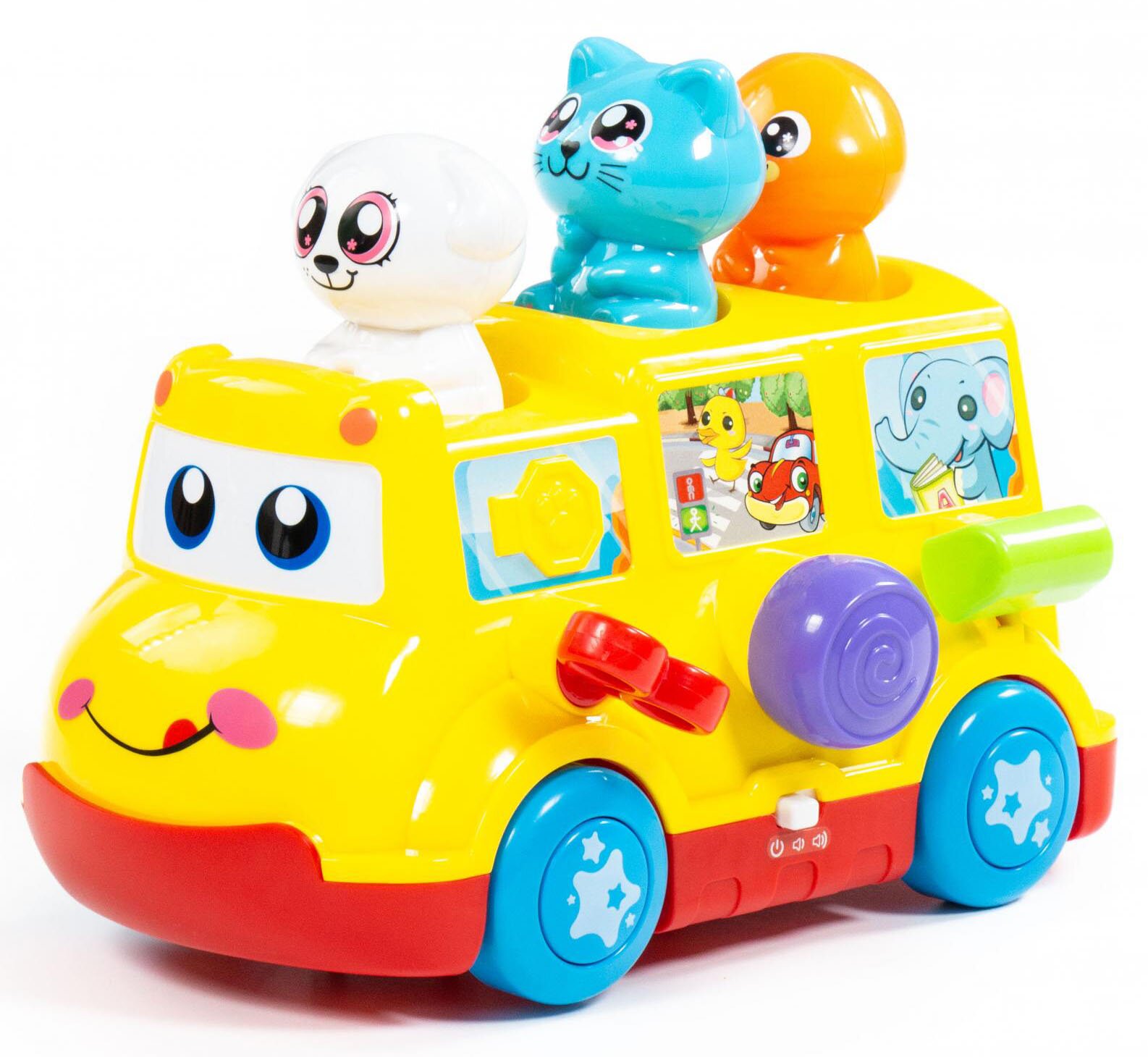 Для того, щоб іграшка почала рух, потрібно натиснути на фігурку на передньому сидінні. Малюк почує звук запалювання, лобове скло машинки засвітиться, почнеться програвання мелодій, й автобус поїде. Коли іграшка рухається, тварини танцюють. Якщо перед автобусом виникне перешкода, він самостійно розвернеться й поїде в іншу сторону. Конструкція автобуса передбачає наявність додаткових озвучених елементів для гри. Елемент у формі ключика імітує звук запалювання під час повороту. Елемент у формі кнопки імітує звук сигналу автомобіля. А елемент у формі важеля імітує звук гальма.