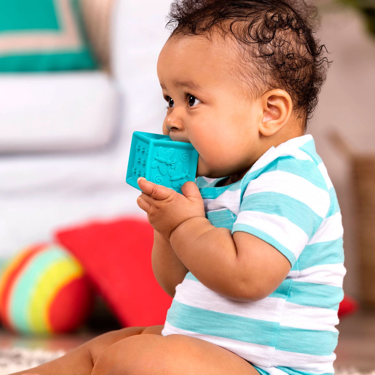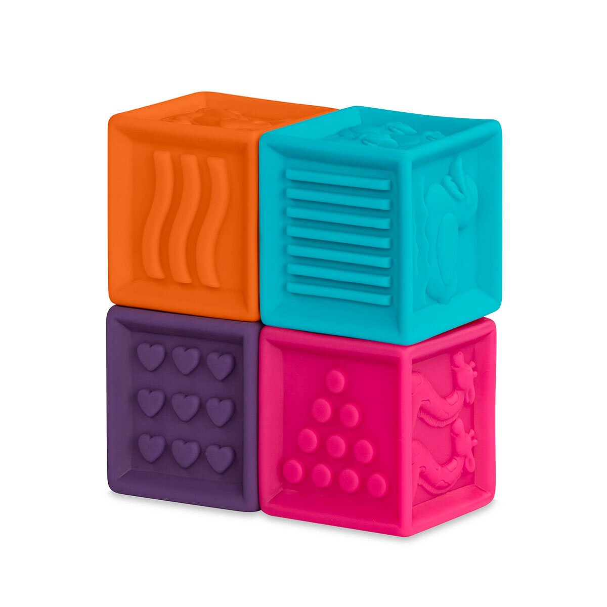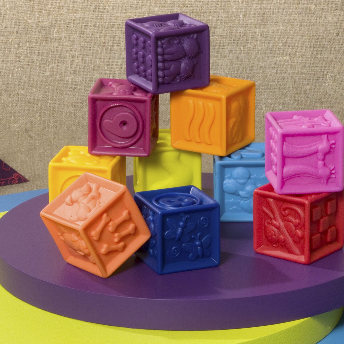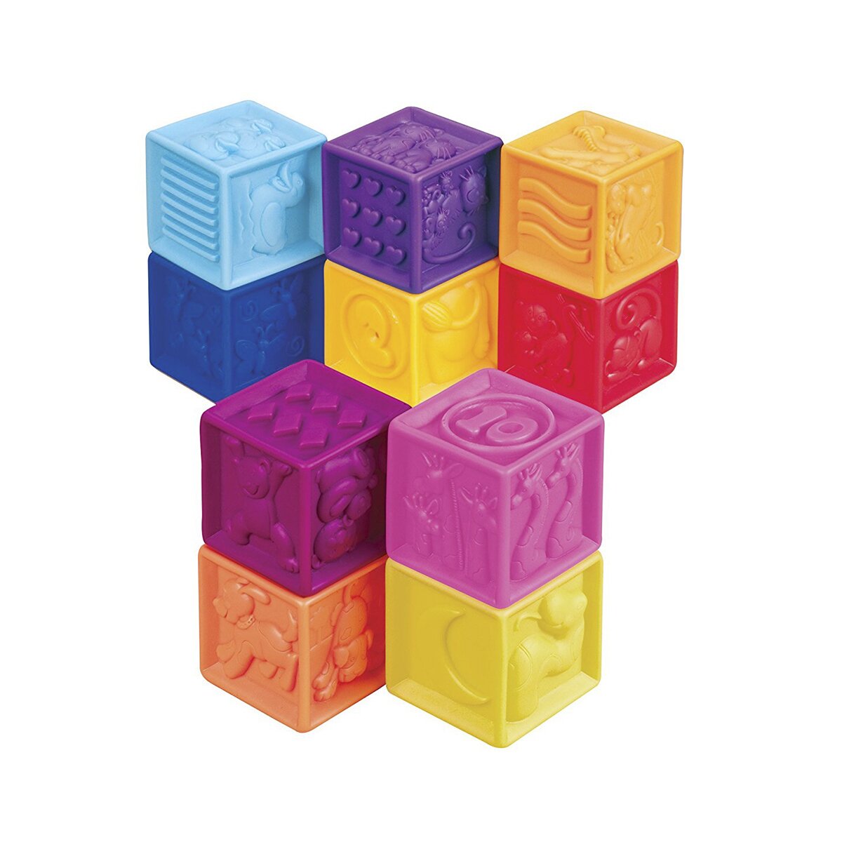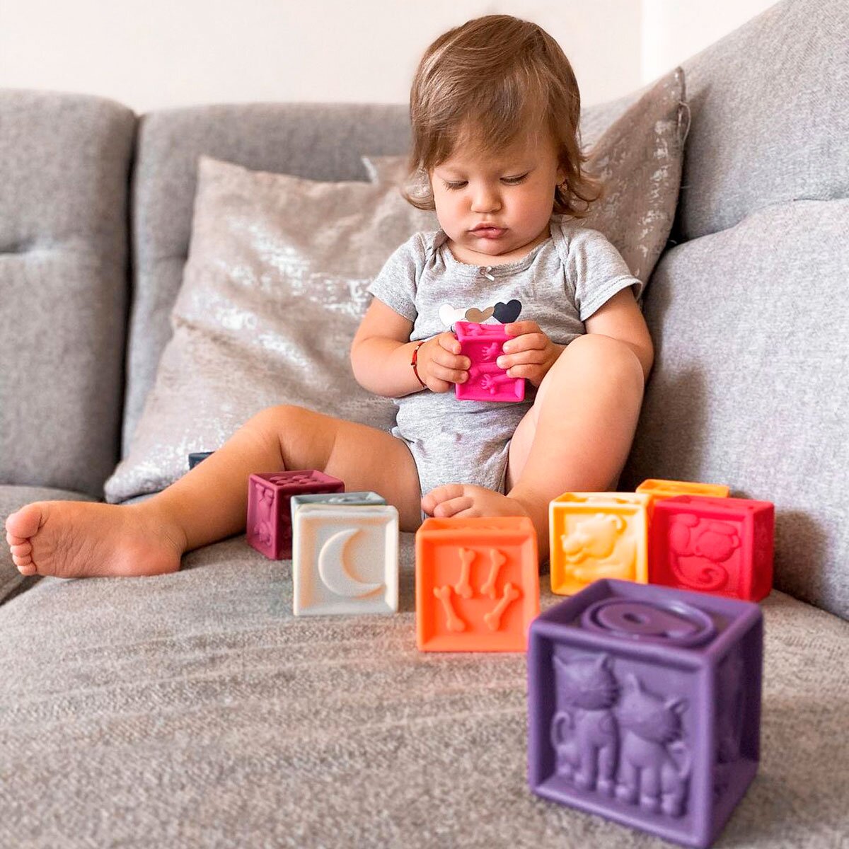 Десять м'яких яскравих кубиків створені спеціально для маленьких дитячих ручок. Усі боки кубиків абсолютно різні, на них зображені цифри від 1 до 10, тварини, предмети та візерунки. Завдяки різним структурам граней іграшка сприяє розвитку мислення, координації рухів, дрібної моторики рук і органів чуття. Кубики можна гризти, їх дуже легко стискати.