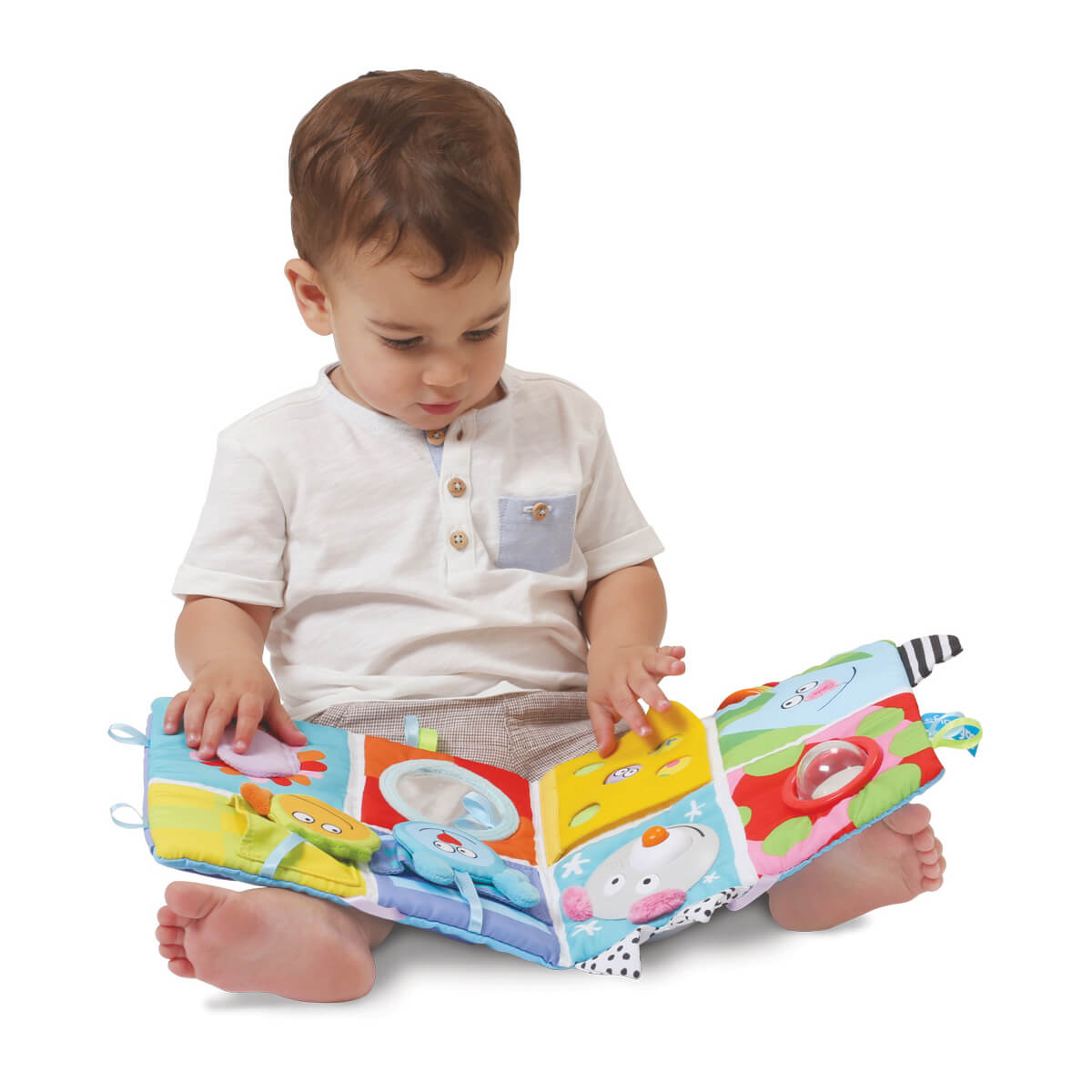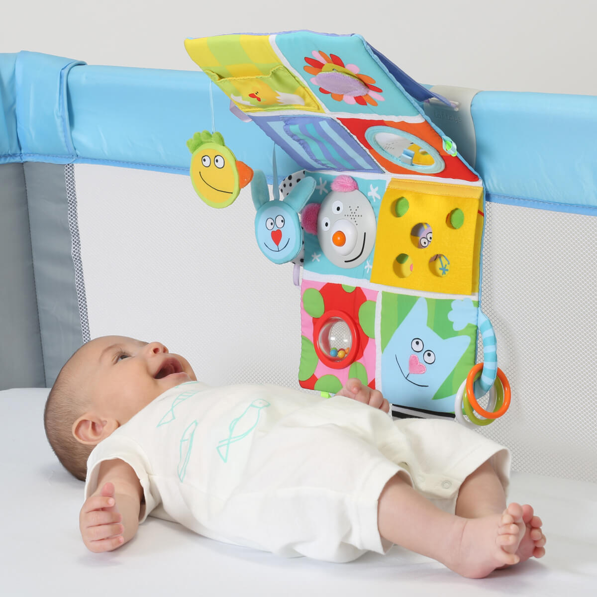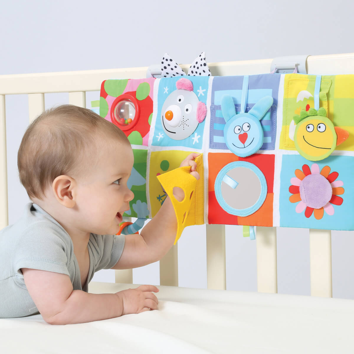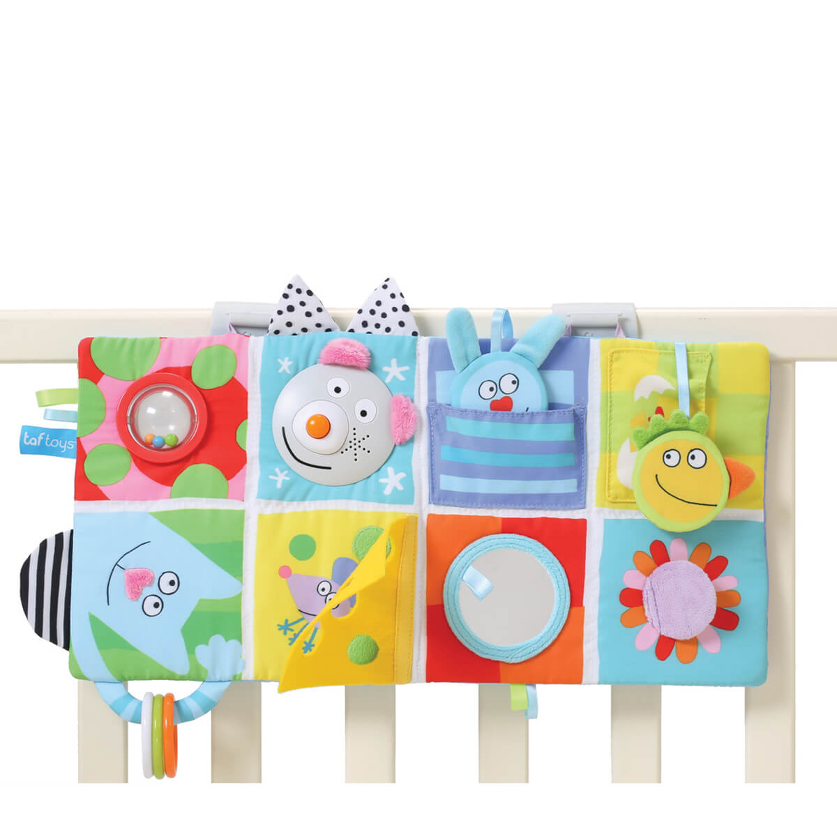 Багатофункціональний розвиваючий центр для ліжечка веселі друзі стане чудовим помічником на перших трьох стадіях розвитку крихти. Найменшим, новонародженим карапузам, буде цікаво спостерігати за яскравими барвистими елементами. Для діток постарше, які вже можуть перевертатися на животик, центр можна закріпити під кутом, щоб вивчення було максимально комфортним. А ті, хто вже впевнено сидить, зможе гратися центром як книжечкою, складаючи і розкладаючи "сторінки".