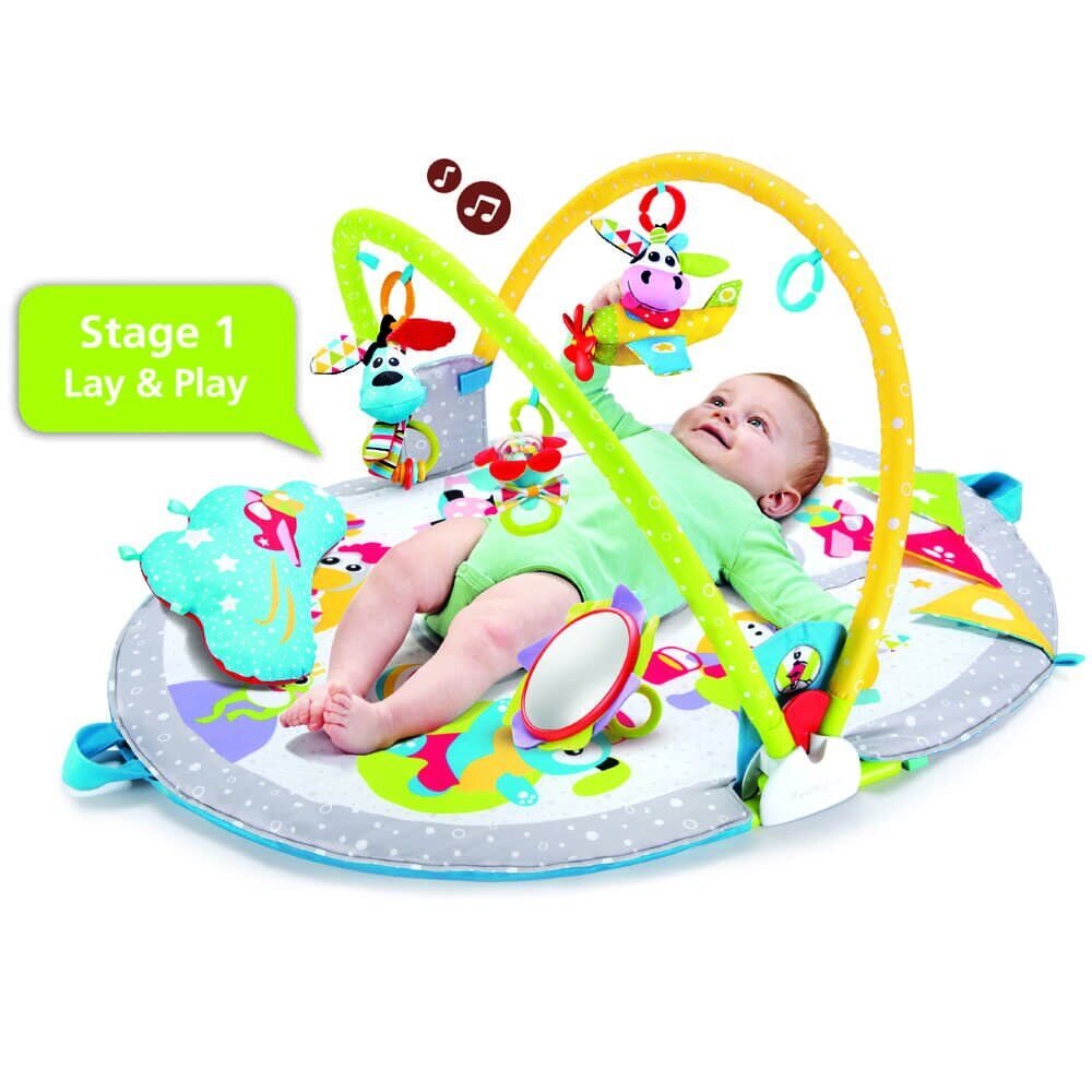 Для гри на килимку передбачено три позиції в залежності від віку дитини позиція 1 (Lay and Play): малюк, лежачи на спинці, розглядає або чіпає іграшки, підвішені на дугах. Позиція 2 (Tummy and Play): дитина лежить на животі, спираючись на подушечку, розглядає себе в люстерко, вивчає оточення і грає брязкальцями. Позиція 3 (Sit-up and Play): килимок з допомогою кріплень трансформується в шезлонг, дитина грає сидячи.