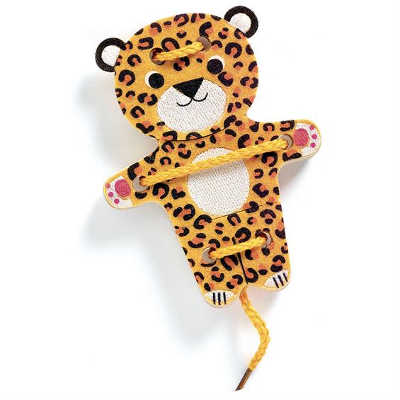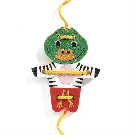 Гра, в якій фрагменти (тварини) поєднуються за допомогою шнурівки. Використовуючи дерев'яний інструмент і шнури, дитина буде весело поєднувати частини тіла тварин, щоб зібрати разом крокодила, зебру, леопарда і папугу, а також створити нових, незвичайних і кумедних тварин.