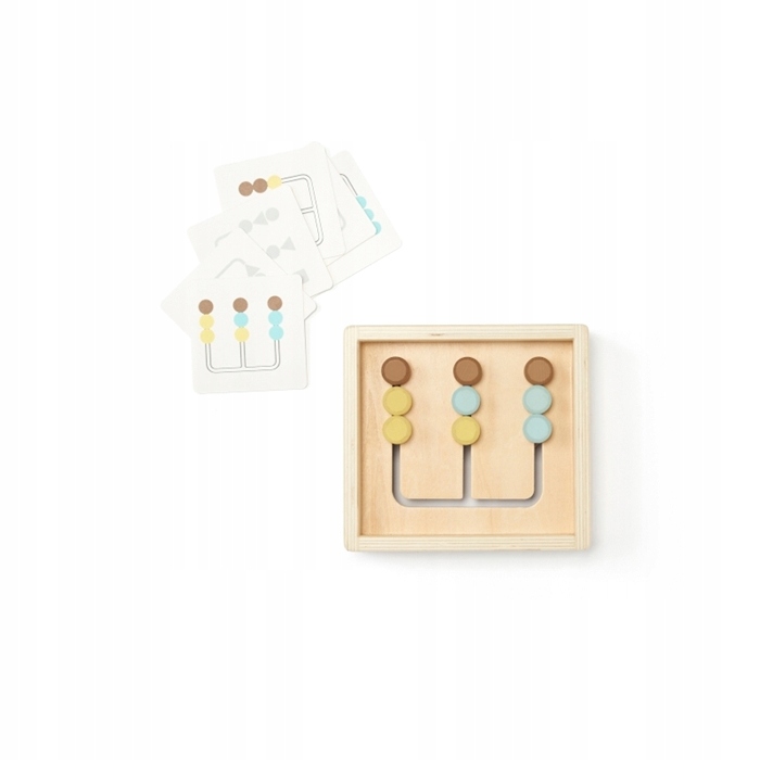 Розвивальна іграшка поєднує кольорові намистини з одного боку та геометричні фігури з іншого. У комплекті є шість двосторонніх карток: одна сторона зразки кольорів, інша — різні форми. Дитина вибирає картку і, переміщуючи елементи, відтворює зображення на дошці. Коли всі завдання виконані, можна вигадувати власні візерунки! Іграшка допомагає розвивати моторику, логічне мислення, уяву, вчить розпізнавати кольори й форми. Виготовлена з сертифікованої деревини FSC та пофарбована безпечними фарбами на водній основі. Відповідає стандартам безпеки CE та EN71.