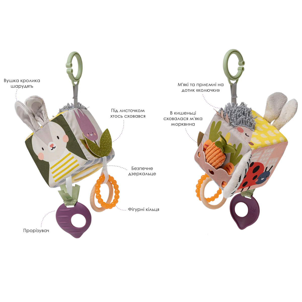Кожна сторона кубика унікальна, містить веселе яскраве зображення, виконана з різних текстурних тканин і має елементи, що розвивають.
