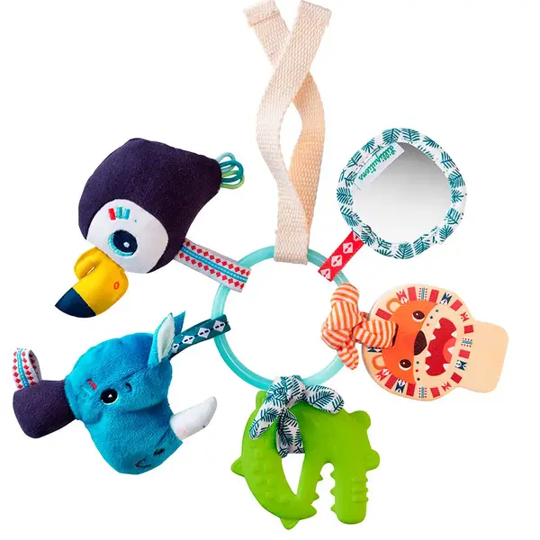 Потягніть за колечко та розглянемо всі елементи ближче. Носоріг Маріус зі звуком брязкальця, тукан Пабло зі звуком паперу, що шарудить, дерев'яний лев Джек, безпечне дзеркальце і крокодил Анатоль зроблений з харчового силікону.