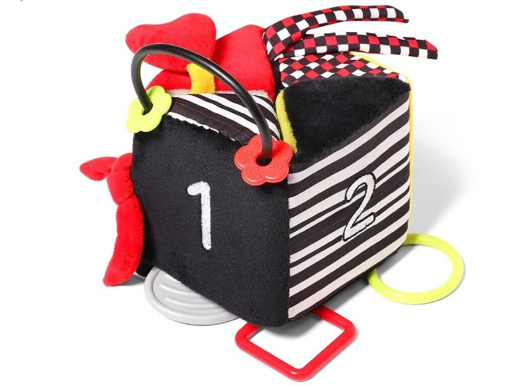 BabyOno C-More (778) - багатофункціональна м'яка розвиваюча іграшка для малюків від народження до року. Має вигляд з'єднаних між собою об'ємних трикутників, що при складанні перетворюються на куб. Іграшка виготовлена у яскравій контрастній кольоровій гамі, а тому добре тренує зір немовляти. Оснащена зав'язками, ґудзиками, незнімними пластиковими елементами різних форм та кольорів.