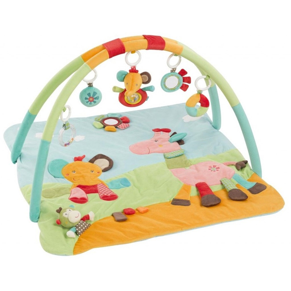 Розвиваючий 3-D килимок Fehn Сафарі (74277) - тривимірний ігровий простір для малюків від народження до 9 місяців. М'яконабивна текстильна основа з об'ємними елементами зробить перебування дитини на підлозі комфортним та безпечним. Бортики килимка легко піднімаються та фіксуються за допомогою кнопок. М'які іграшки-підвіски, що кріпляться до перехрещених дуг, спонукатимуть малюка рухатись, тренуватимуть дрібну моторику, тактильні відчуття, зір та слух.