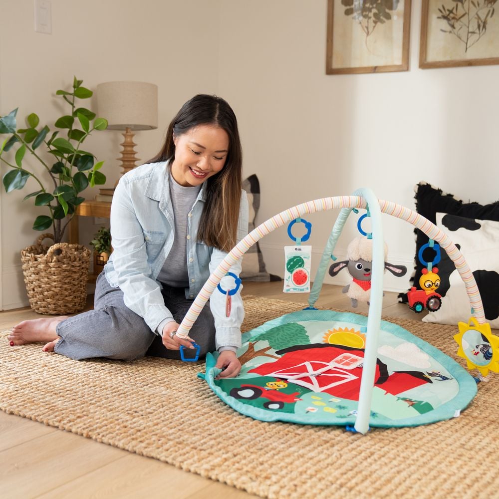 Baby Einstein "Happy Harvest" ‒ м'який ігровий килимок з дугами, підвісними іграшками, звуковими ефектами та мелодіями познайомить МАлюка з буднями фермерського життя.