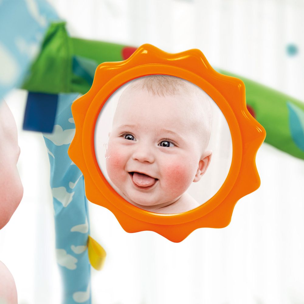 5 знімних іграшок: листочок-гризун, безпечне дзеркало у формі сонця, плюшева киця з пискавкою, м’яка пташка з різними текстурами та елементами, хмаринка створює ефект дощу, завдяки падаючим намистинам;