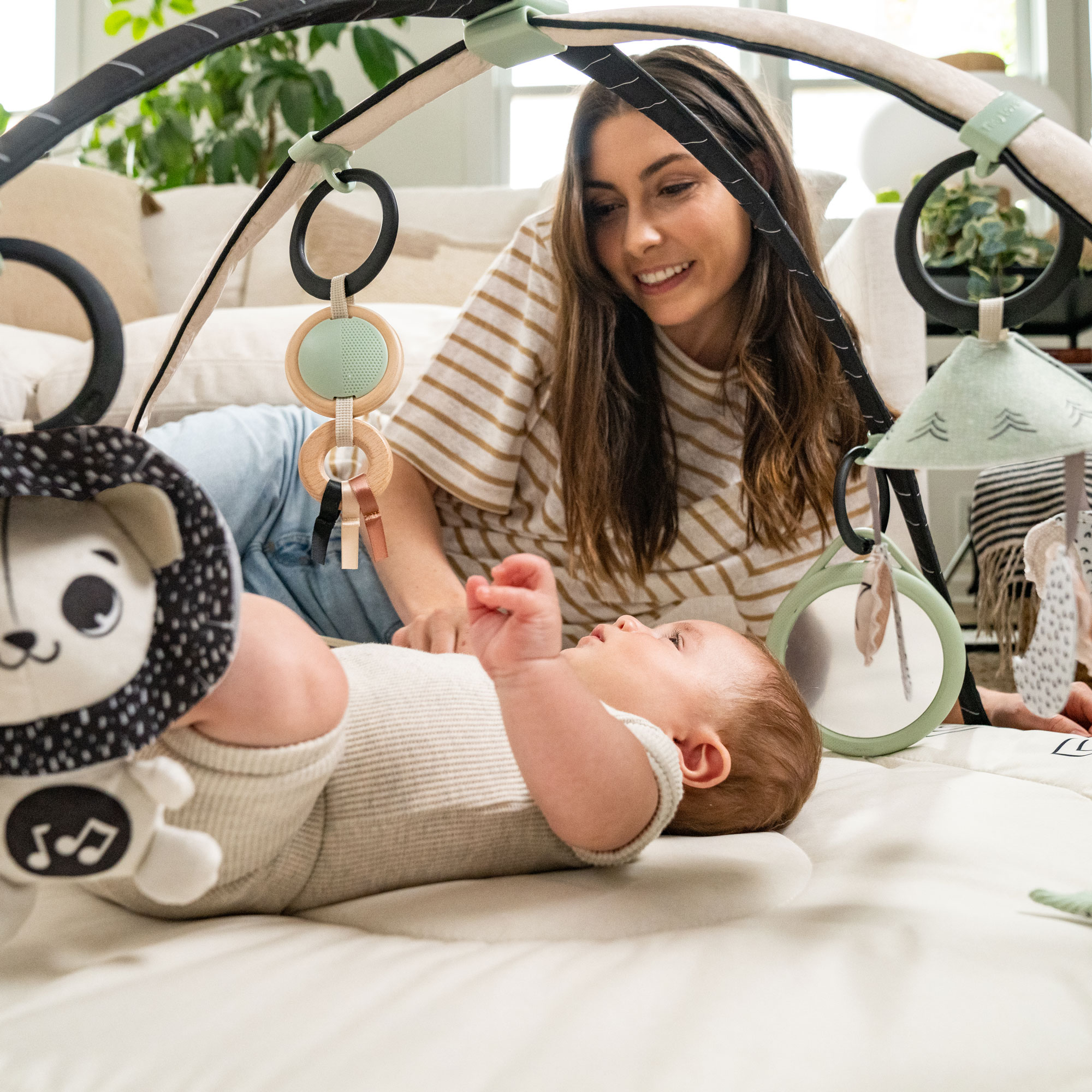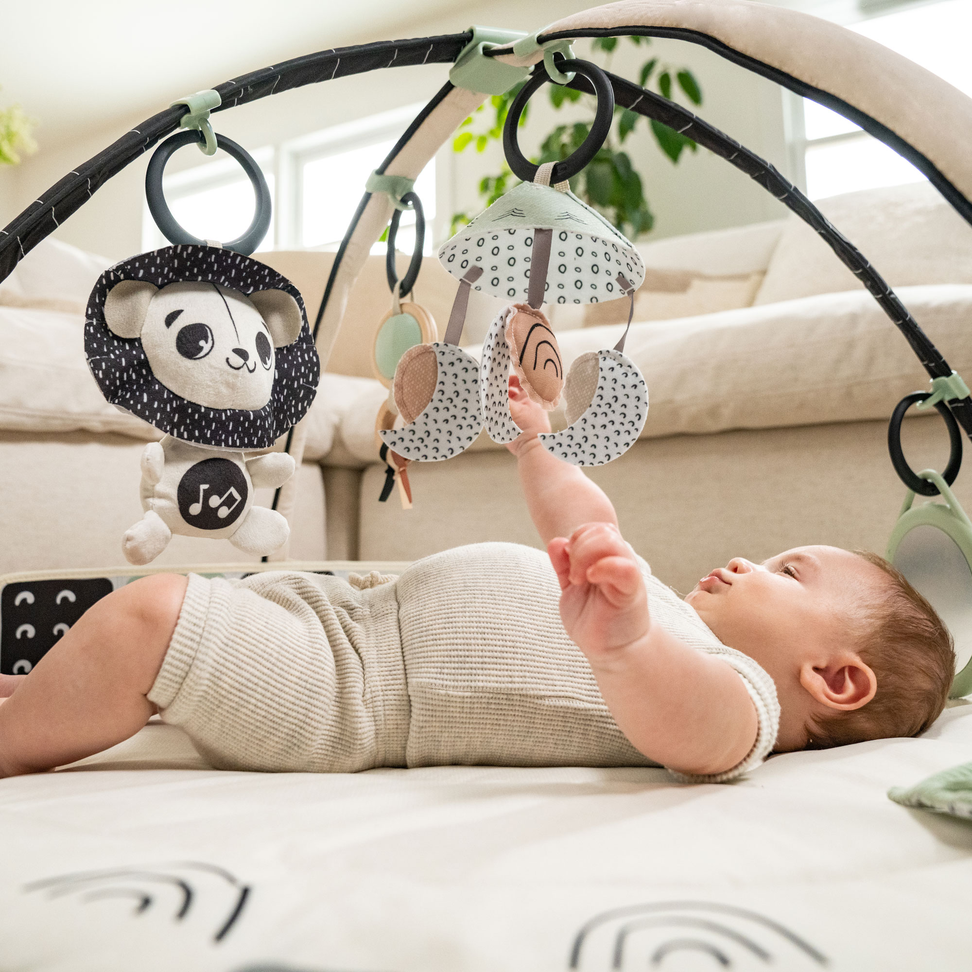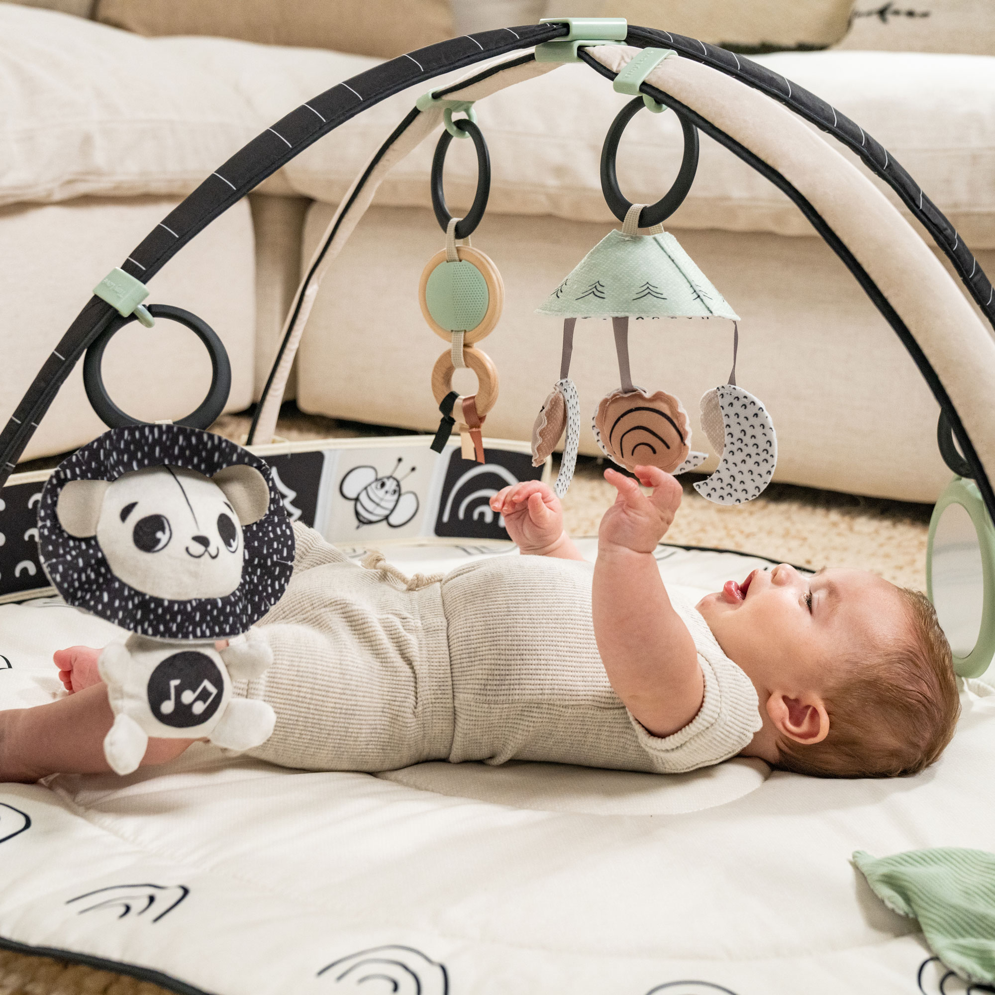 Контрастні чорно білі картинки, різні текстури та музична іграшка впливають на органи почуттів із першого дня. Дозвольте малюку дотягнутися до іграшок, доторкнутися і уважно розглянути їх.