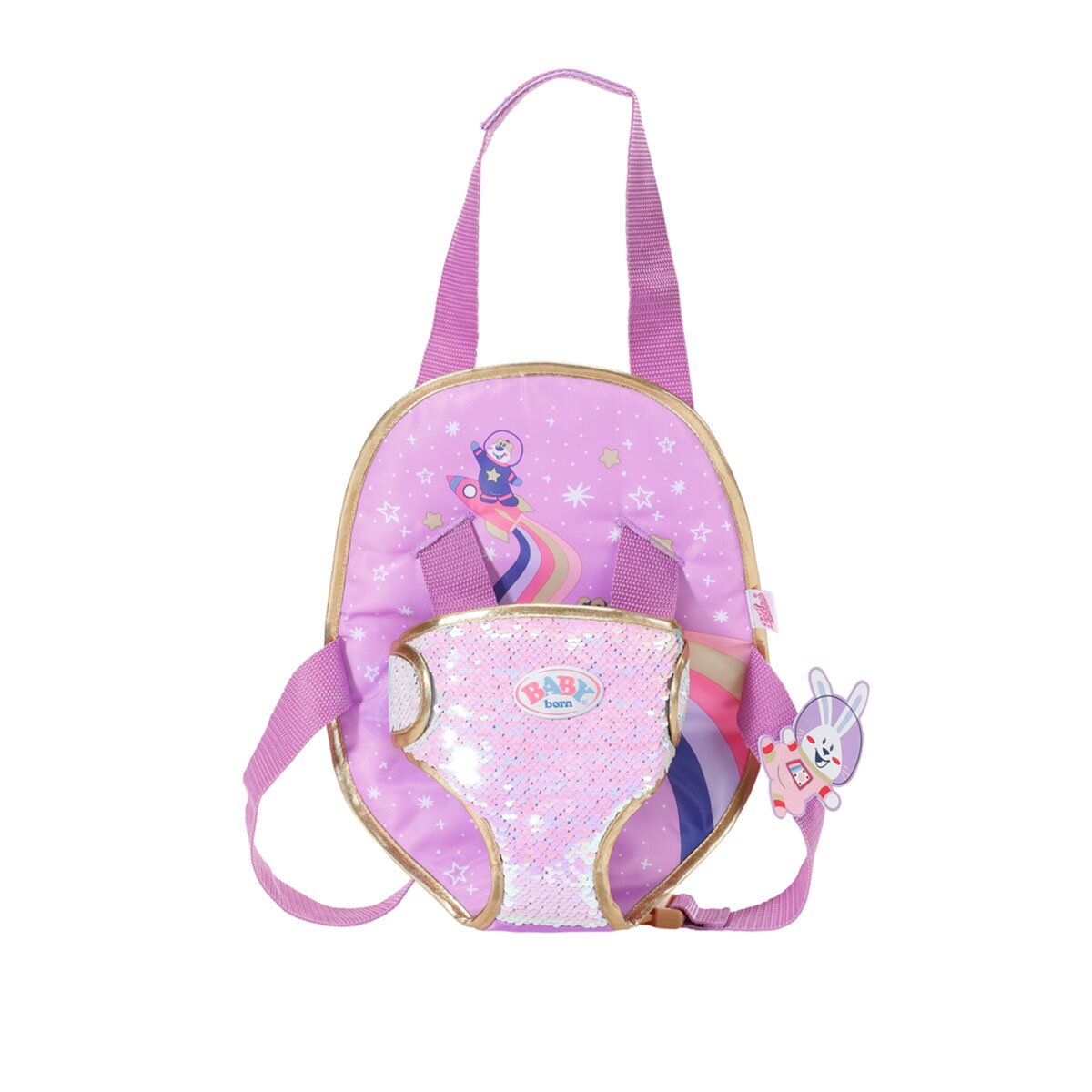 Рюкзак-кенгуру для ляльки Baby Born серії День Народження Прогулянка - шикарний та комфортний аксесуар для вашого малюка. У ньому зручно носити лялечку обличчям уперед, або обличчям "до матусі". Його ремені регулюються, що дозволяє використовувати його для будь-яких ляльок від 34 см до 46 см. Новий яскравий дизайн з принтами. Передня частина прикрашена паєтками, що змінюють колір з перлинно-рожевого на перлинно-бірюзовий.