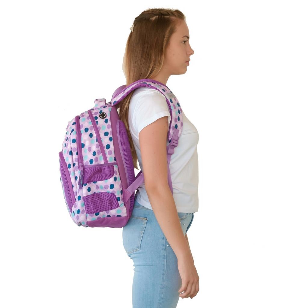 Рюкзак шкільний SG-25 "Violet spots" вміщує максимальна кількість речей завдяки двом основним відділам. Підручники і зошити учнів завжди будуть в порядку, завдяки двом внутрішнім роздільникам і органиайзеру. Додатково рюкзак Smart оснащений одним переднім кишенею і двома бічними. Передній кишеню виділено світловідбиваючими елементами. Дно рюкзака м'яке. М'яка основна ручка для зручного перенесення та додаткова ручка-петля. Матеріал: поліестер, водовідштовхувальний.