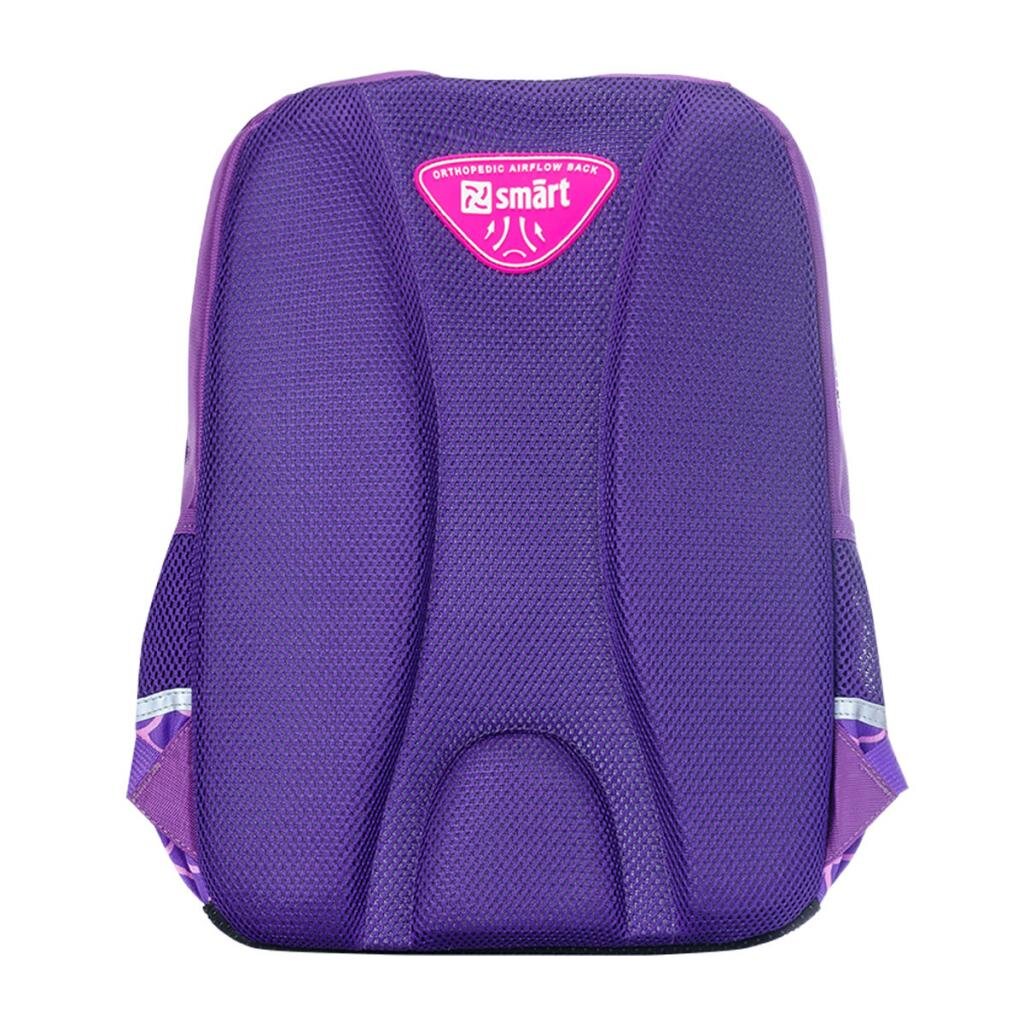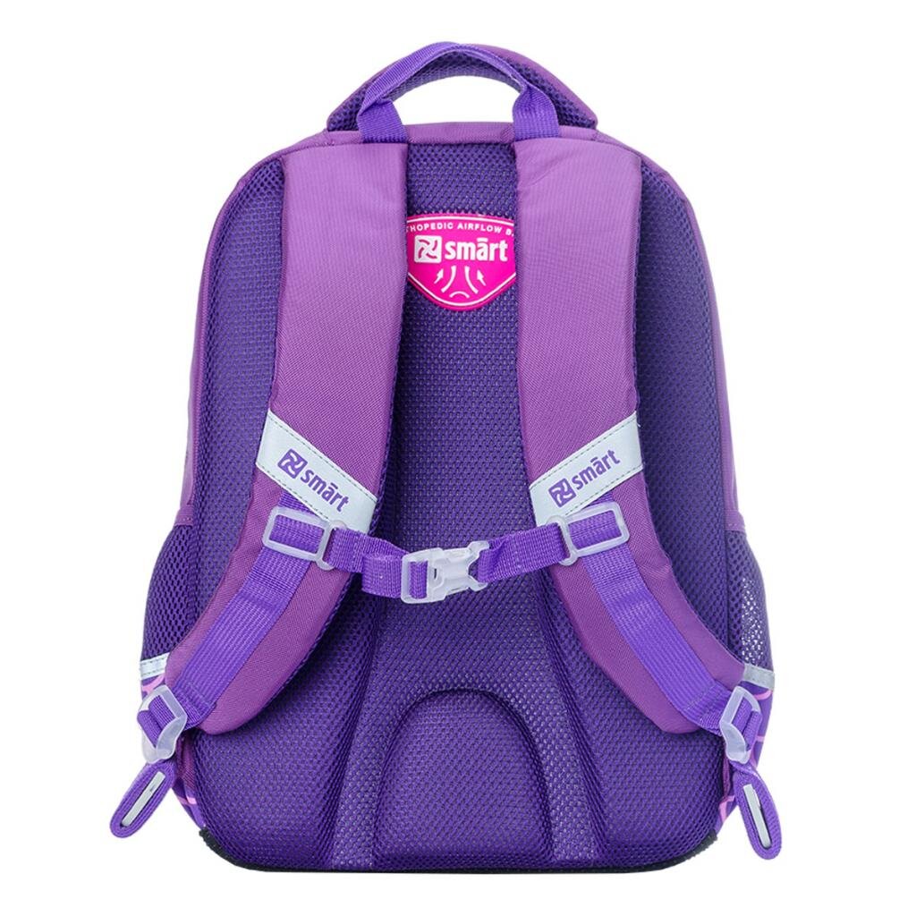 Шкільний рюкзак на два вітділення. Три кишені: одна із блискавкою на фронтальній стороні, дві по боках. В основному відділі - роздільник для зошитів. Анатомічна спинка. Анатомічні, S-подібної форми лямки. Нагрудний ремень. Дно посилено пластиковою вставкою. М'яка ущільнена ручка, ручка петля для розміщення на гачку. Розмір: 42 х 30 х 18 см.