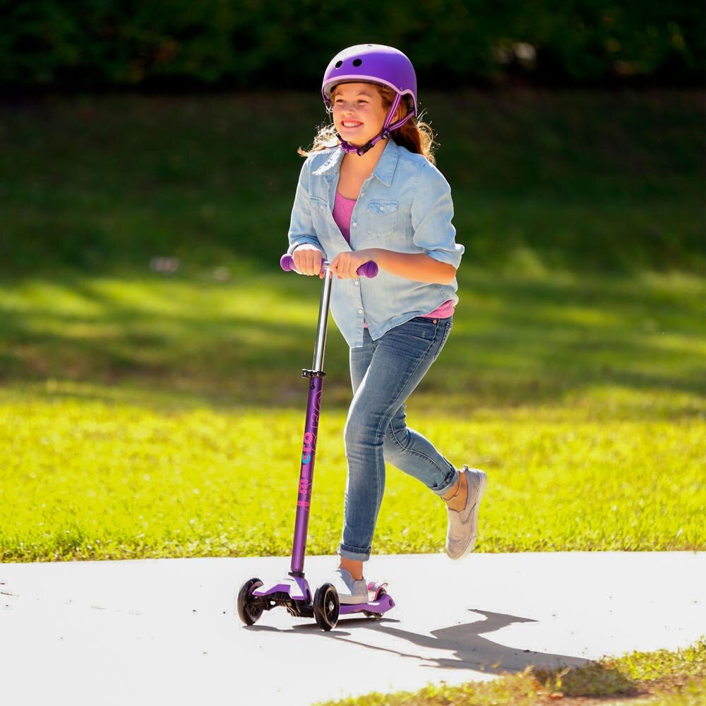 Проводьте дозвілля активно, катаючись на самокаті Micro Maxi deluxe. Модель фіолетового кольору сподобається як хлопчикам, так і дівчаткам. Кермо регулюється в декількох положеннях, щоб пристосуватися до зростання дитини. Колеса з підшипниками стандарту АВЕС 9 забезпечують безшумне пересування. Можете не сумніватися в безпеці транспорту, адже стійка виготовлена з анодованого матеріалу, тому витримає будь-які удари, а дека посилена скловолокном.