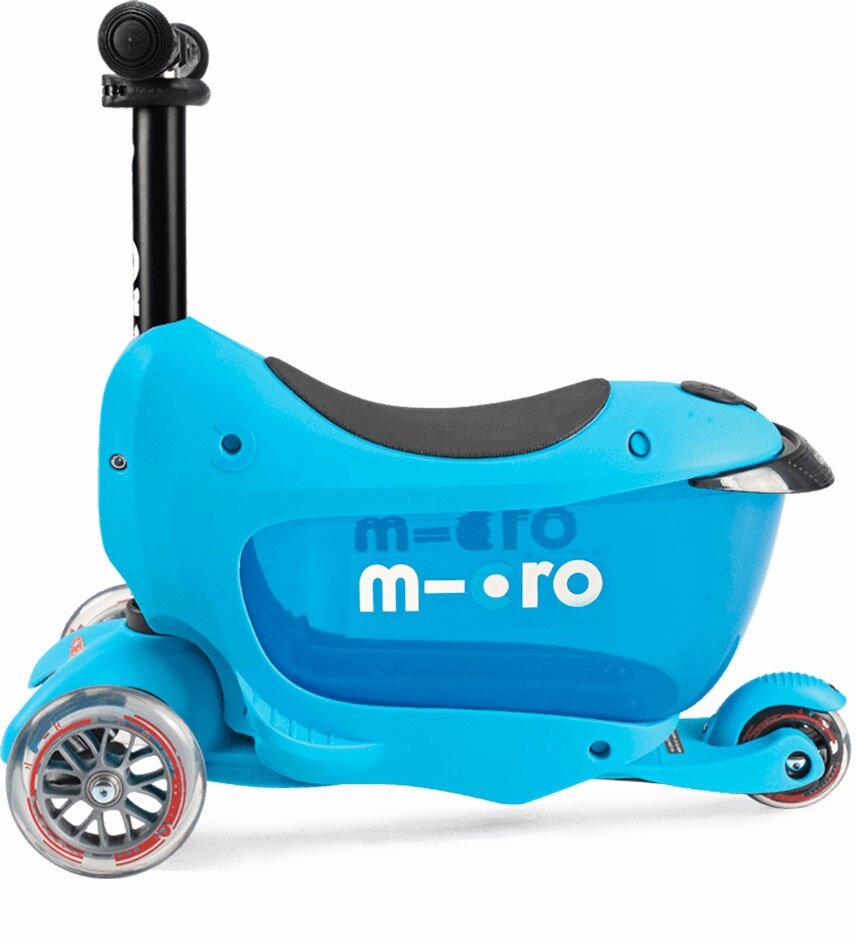 Самокат Micro Mini 2Go Deluxe Plus є вдосконаленою моделлю класичного Micro Mini 2Go Deluxe. Він також сконструйований для дітей молодшого віку та має, на відміну від класичної моделі, оновлений дизайн деки. На ній є додаткові виступальні елементи, а саме логотип micro, які знижують ковзання ноги під час підвищеної вологості або дощу. У цій моделі також є сидіння з багажним відділенням. Його простір може бути використаний як для особистих речей та іграшок, так і для зберігання напоїв або продуктів під час прогулянки на природі або в парку. У разі необхідності сидіння можна зняти, і mini2go deluxe перетворюється в mini micro deluxe. Завдяки цьому він підійде за віком дітям, починаючи з 18 місяців і до 5 років. Максимально допустиме навантаження на самокат серії mini deluxe збільшилося й тепер становить 35 кг. Максимальне навантаження на сидіння залишилося тим самим і становить 20 кг. Ця модель самоката, на відміну від звичайної моделі Mini2go Deluxe, комплектована телескопічною стійкою, яка кріпиться в задній частині самоката. За її допомогою батьки зможуть самостійно керувати самокатом або ж допомагати дитині в керуванні. Модель самоката Mini2go Deluxe Plus також комплектована світлодіодним ліхтариком, який встановлений у корпусі сидіння й освітлює короб для іграшок. Якщо є охота, ліхтарик можна встановити на кермовій стійці за допомогою спеціального силіконового кріплення. Micro Mini 2Go Deluxe Plus — мобільність і практичність в одному самокаті.
