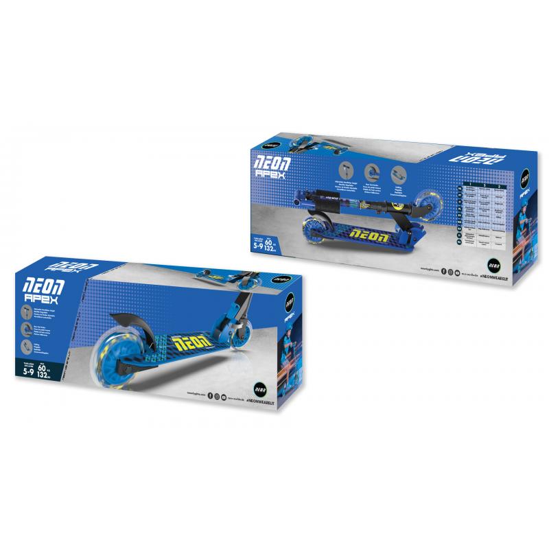 Neon Apex LED – це стильний та легкий самокат. Регульоване кермо Super Grip і заднє гальмо роблять це самокат одним з наших найуніверсальніших самокатів для повсякденного використання. Просто покладіть кермо і приберіть його на зберігання наступного дня. LED підсвічування коліс покращує безпеку в умовах низького освітлення, що робить цей самокат ідеальним варіантом пересування.