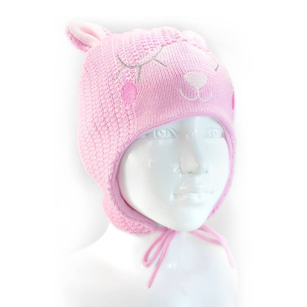 В'язана шапка з трикотажною підкладкою для малюка від народження до 12 місяців. Є захист вух дитини від вітру, зав'язки. Склад: 100% бавовна. Колір - рожевий. Рельєфна в'язка. Прикрашена вушками та вишивкою у вигляді мордочки сплячого котика.