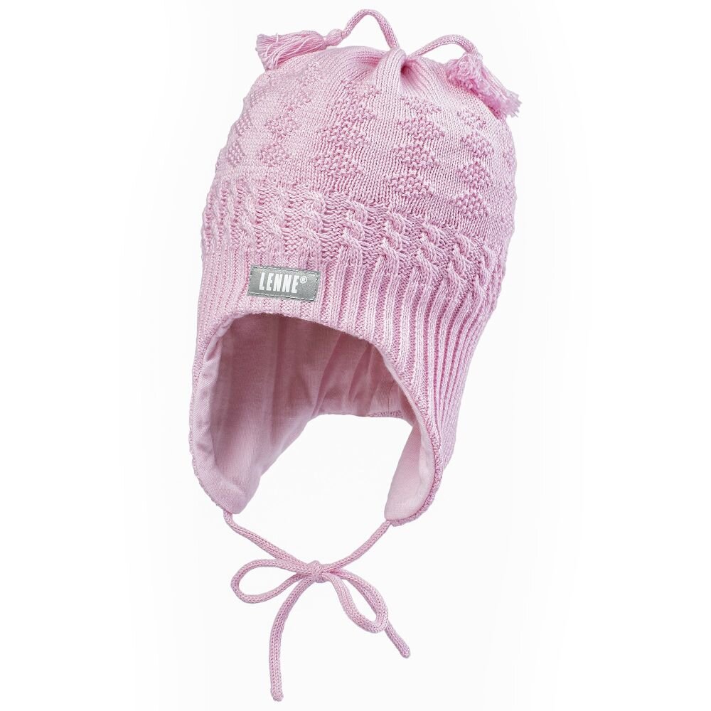 Трикотажна демісезонна шапка з підкладкою для малюка з народження до 6 місяців. Є мембрани для захисту вух дитини від вітру, зав'язки. Прикрашена двома китицями. Склад: 100% бавовна. Колір - рожевий.
