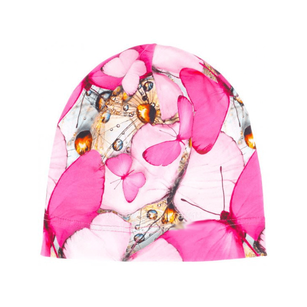 Демісезонна шапка з щільного еластичного трикотажу для малюка до року. Без зав'язок. Прикрашена зображенням милих рожевих метеликів. Підійде дівчинці. Склад: 92% бавовна, 8% еластан.