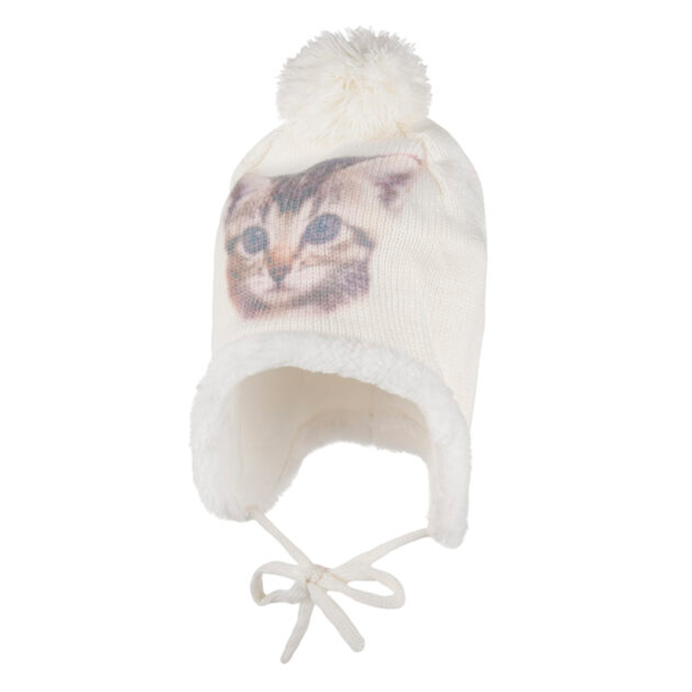 В'язана тепла шапка з бавовняною підкладкою для малюка 3-4 років. Є захист вух дитини від вітру, зав'язки. Прикрашена помпоном. Склад: 50% вовна, 50% акрил. Колір - молочний. Принт - кошеня.