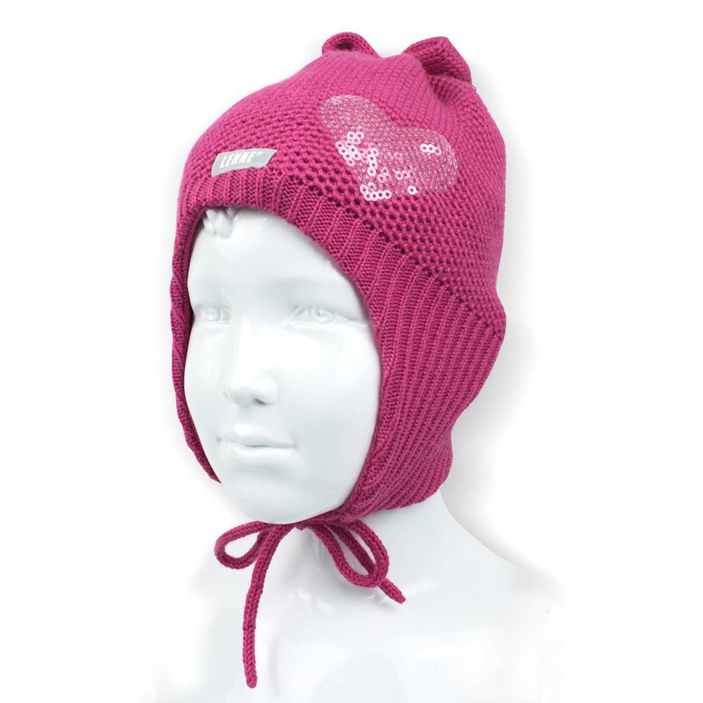 В'язана тепла шапка з бавовняною підкладкою для малюка 3-4 років. Є захист вух дитини від вітру, зав'язки. Прикрашена бантом. Склад: 50% вовна, 50% акрил. Колір - рожевий. Вишивка паєтками "сердечко".