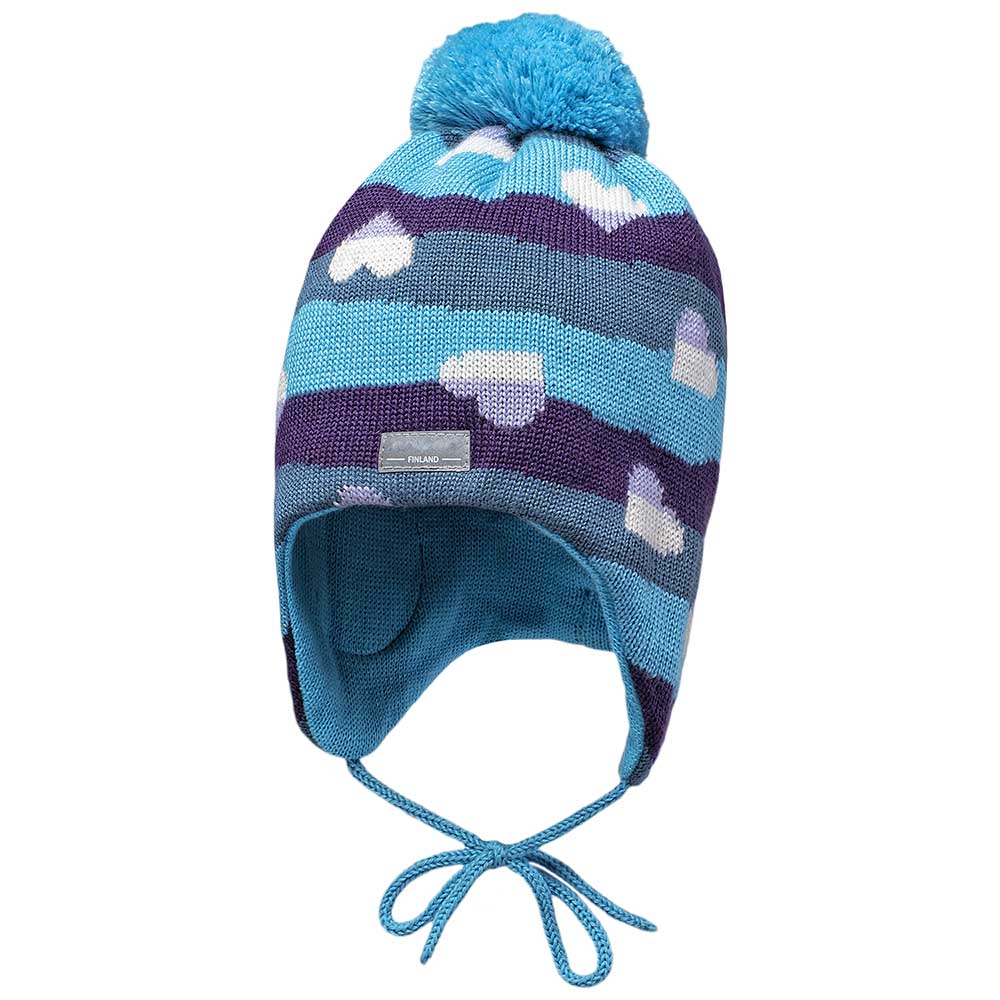 В'язана тепла шапка з бавовняною підкладкою для малюка 5-6 років. Є захист вух дитини від вітру, зав'язки. Прикрашена помпоном. Склад: 50% вовна, 50% акрил. Колір - блакитний, синій, фіолетовий. Принт "сердечко".