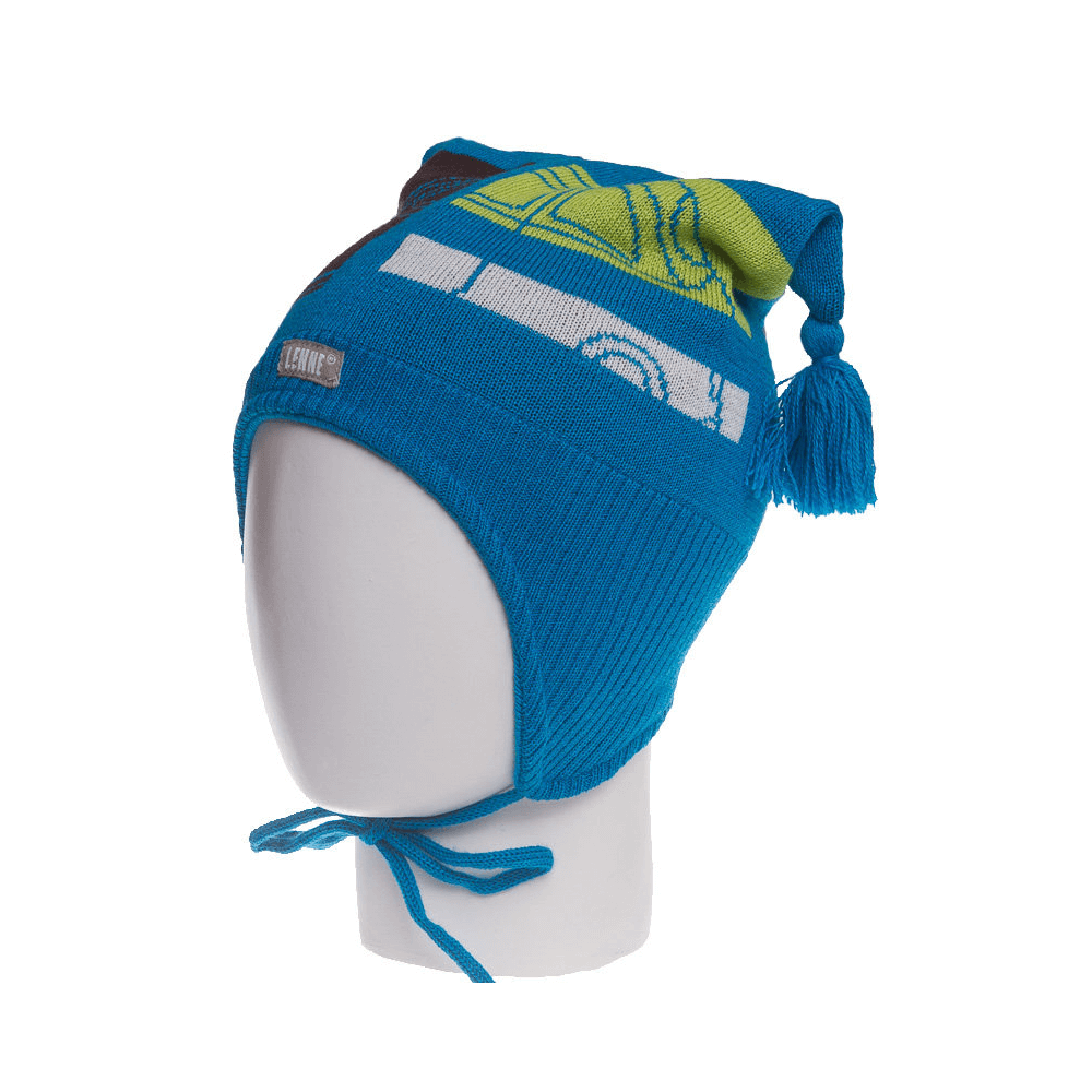 Трикотажна зимова шапка з китицями для хлопчика на 1-2 роки. Малюнок - машинки. Колір - синій. Розмір - 48. Склад верхнього шару: 50% вовна, 50% акрил. Підкладка - 100% котон.