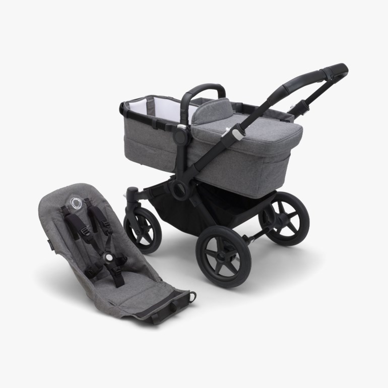До комплекту Bugaboo для коляски Bugaboo Donkey 5 (100002028) входить чорне шасі та прогулянковий блок з текстилем сірий меланж.